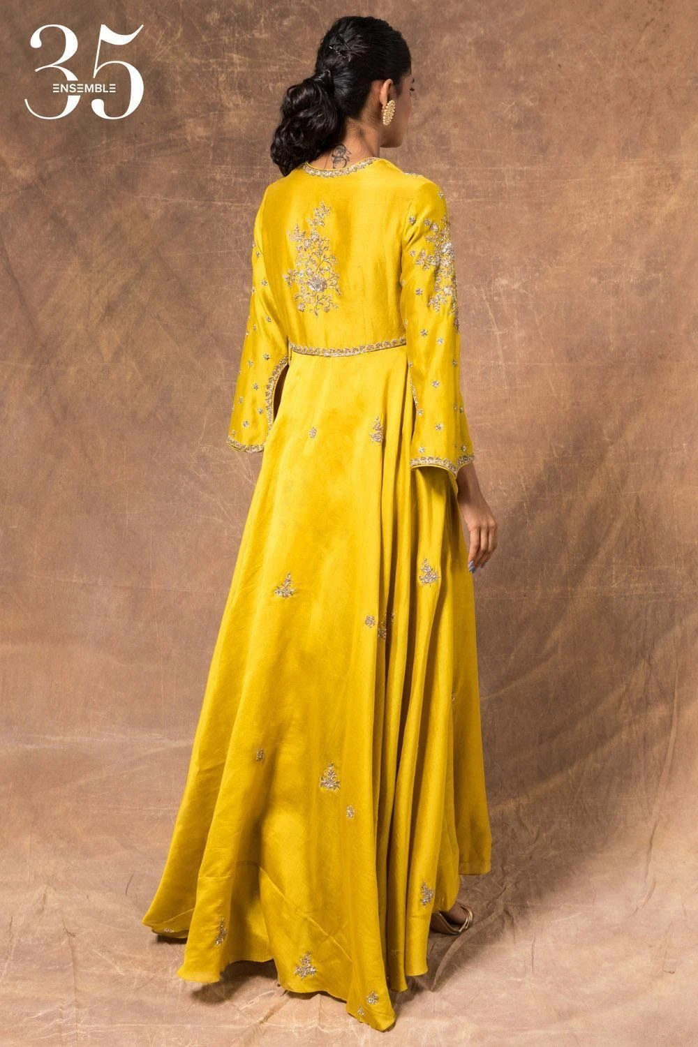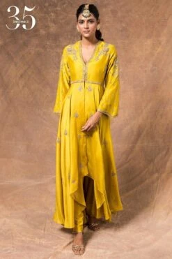 A yearlong celebration of its 35th anniversary telling the story of modern Indian fashion. Featuring a beautiful interplay of feminine silhouette & elegant embroidery put together with this mustard anarkali. It is paired with matching flared pants.
