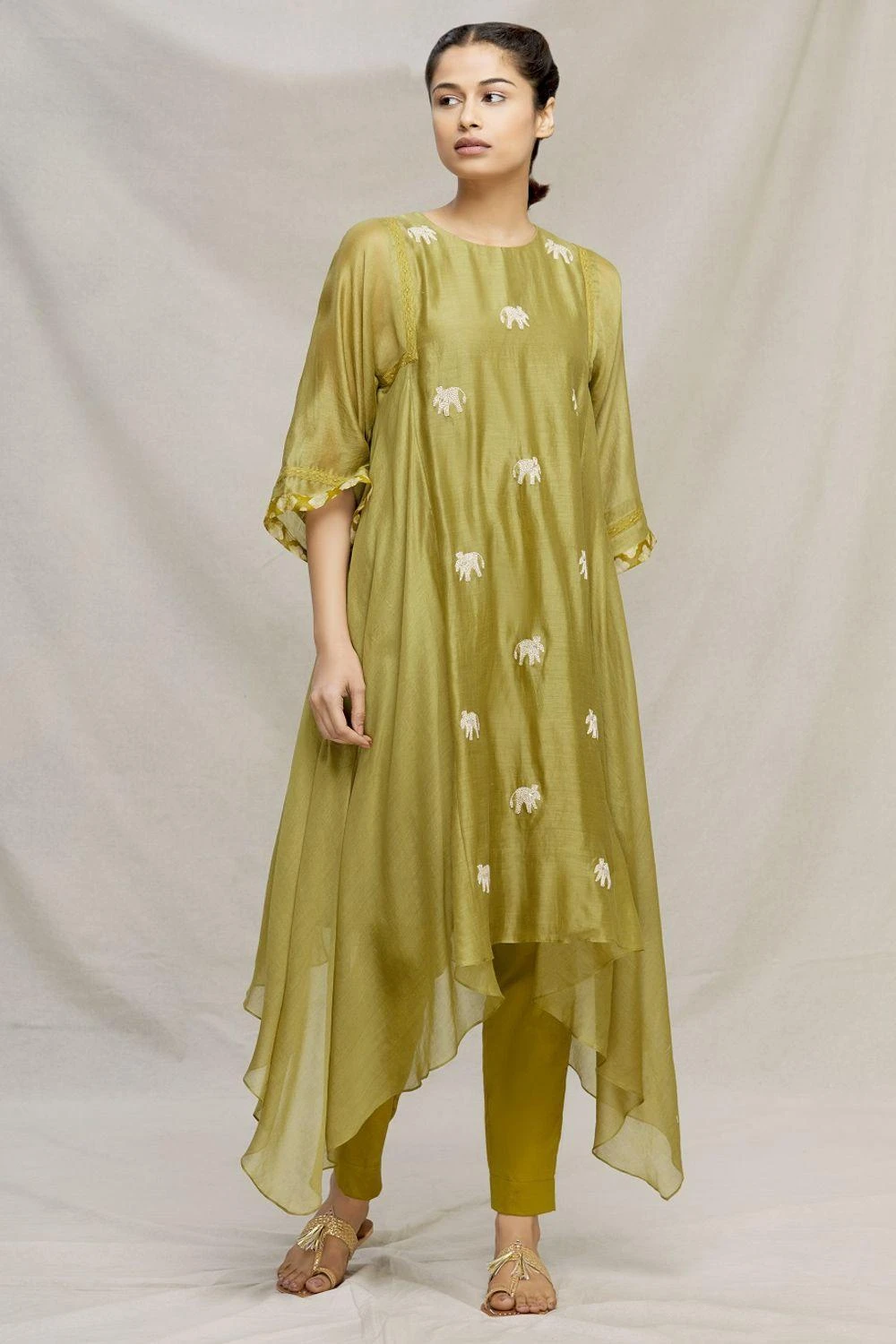 This mehendi green chanderi kurta & dupatta set is highlighted with elephant motif hand embrodiery. Style this set with a churidar or palazzos & jhumkas to complete the look.