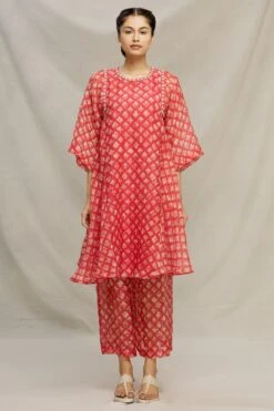 This elegant red floral batik printed kurta set is highlighted with thread embroidery. Style this elegant set with pearl studs or silver jhumkas to accessorise this look.