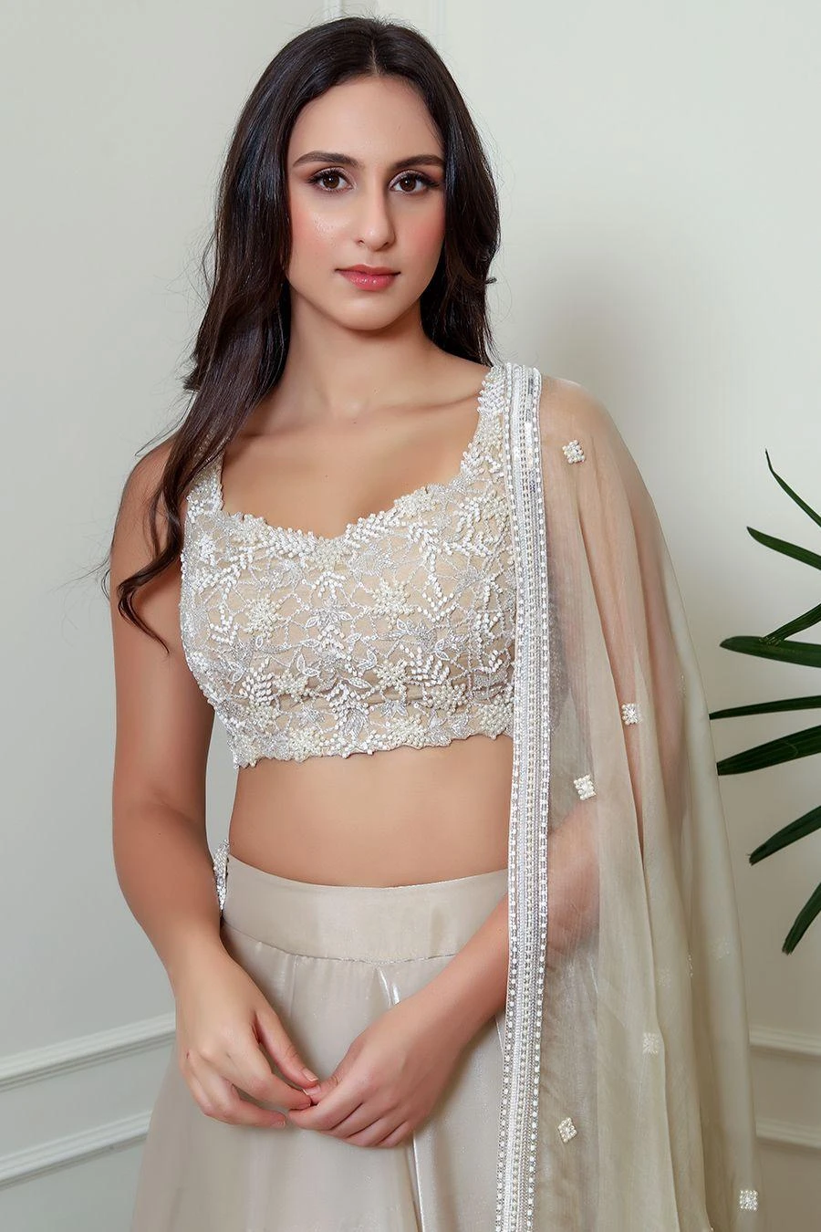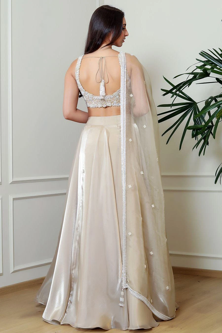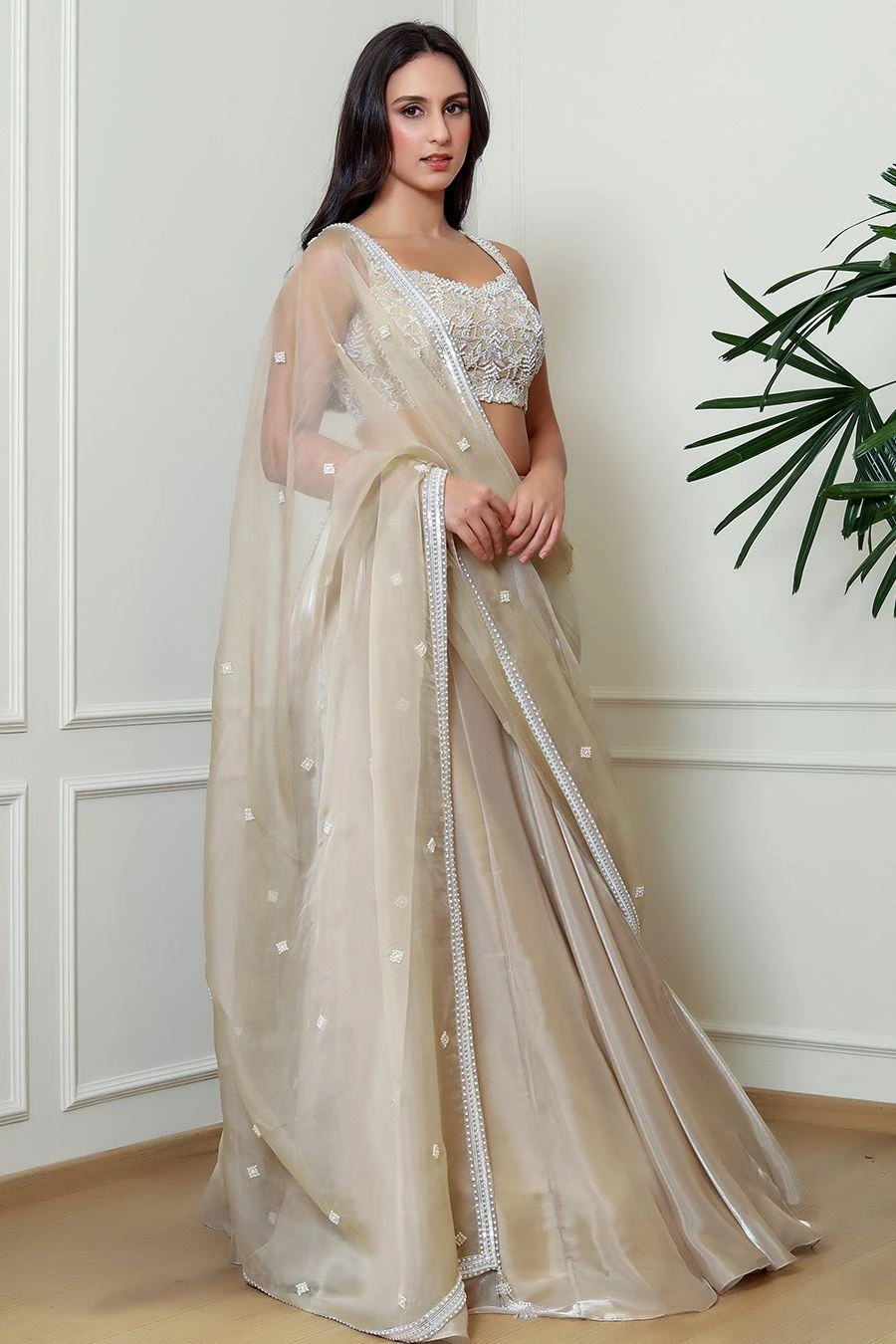Look effortlessly stylish with this lehenga set. Crafted in organza, this set features a crystal embellished blouse paired with a coordinating dupatta & lehenga. Add a pair of statement earrings to complete the look.
