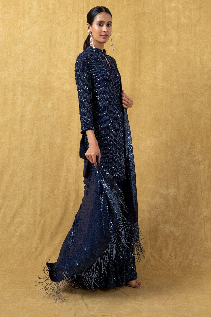 The perfect amalgamation of style & comfort, this set works across occasions. Crafted in chiffon, this set features a sequin embroidered kurta paired with a coordinating sharara and a dupatta. Add a pair of statement earrings to complete the look.