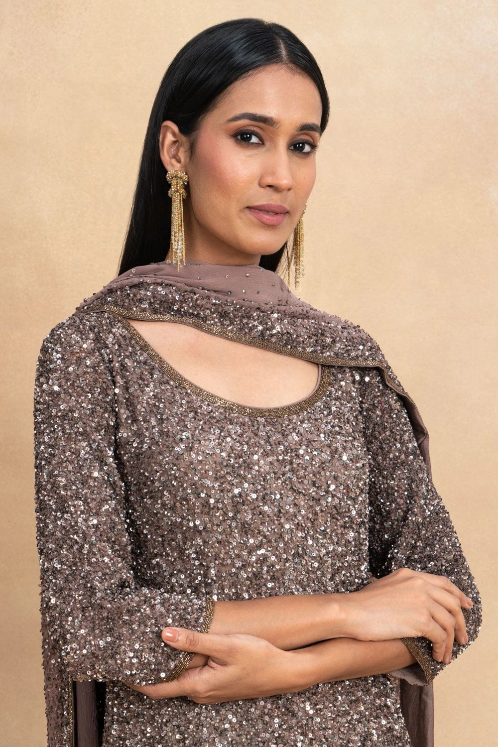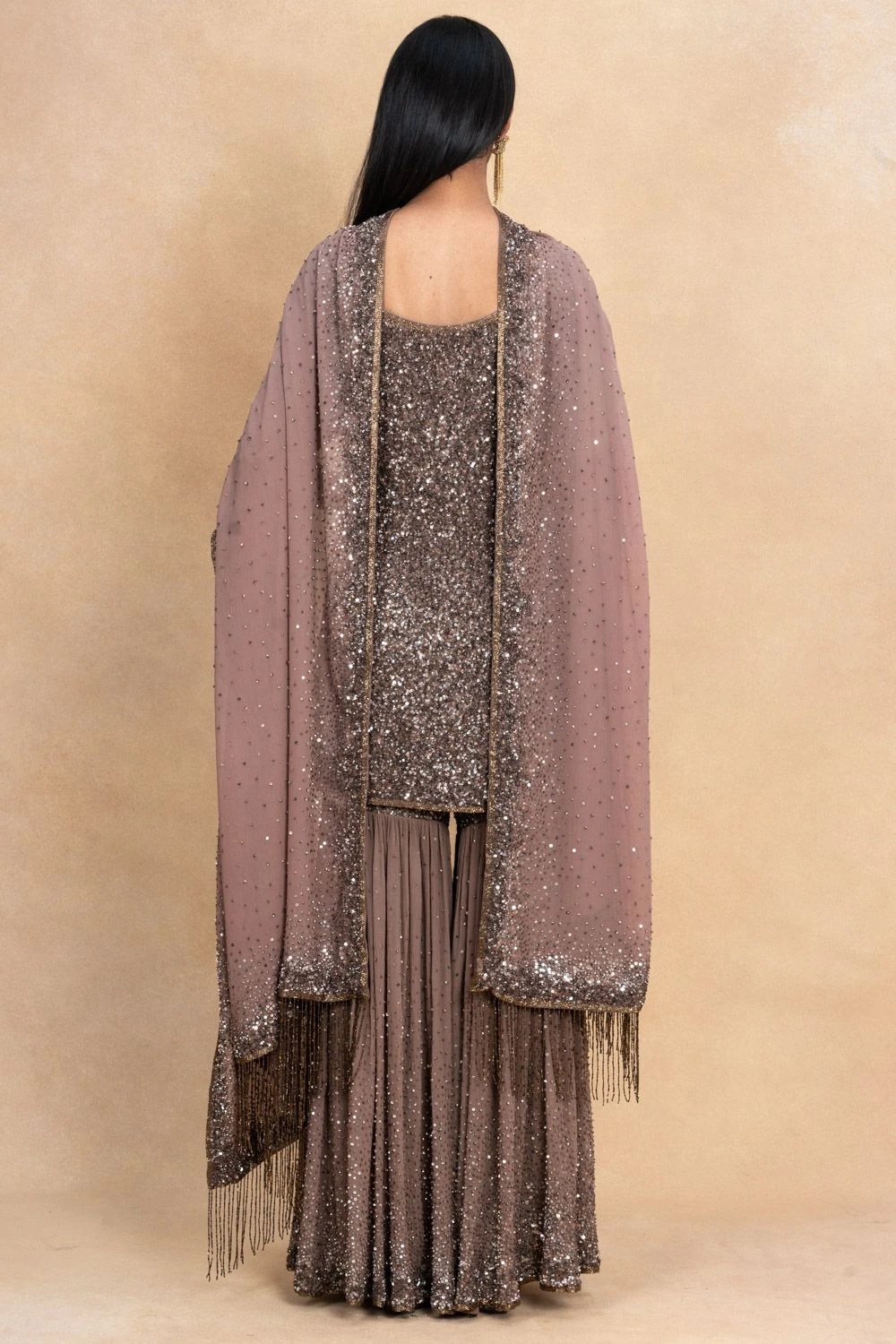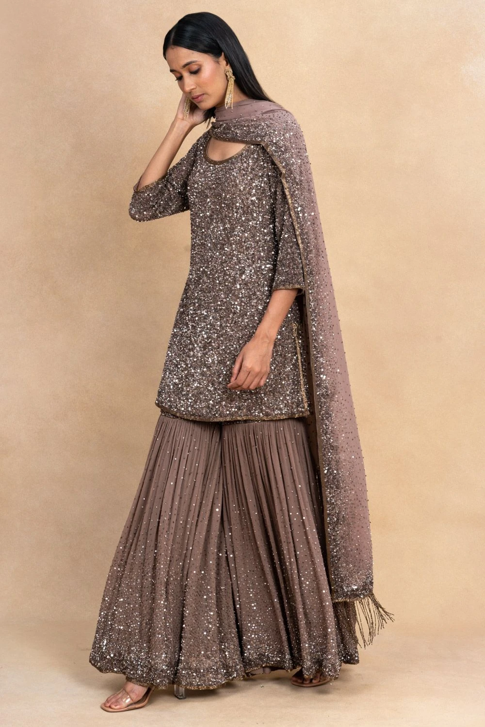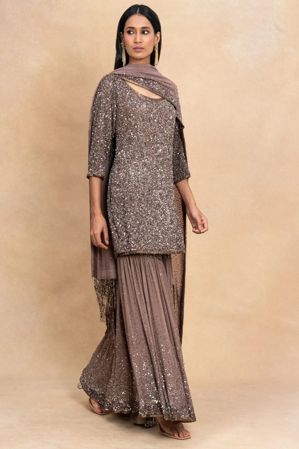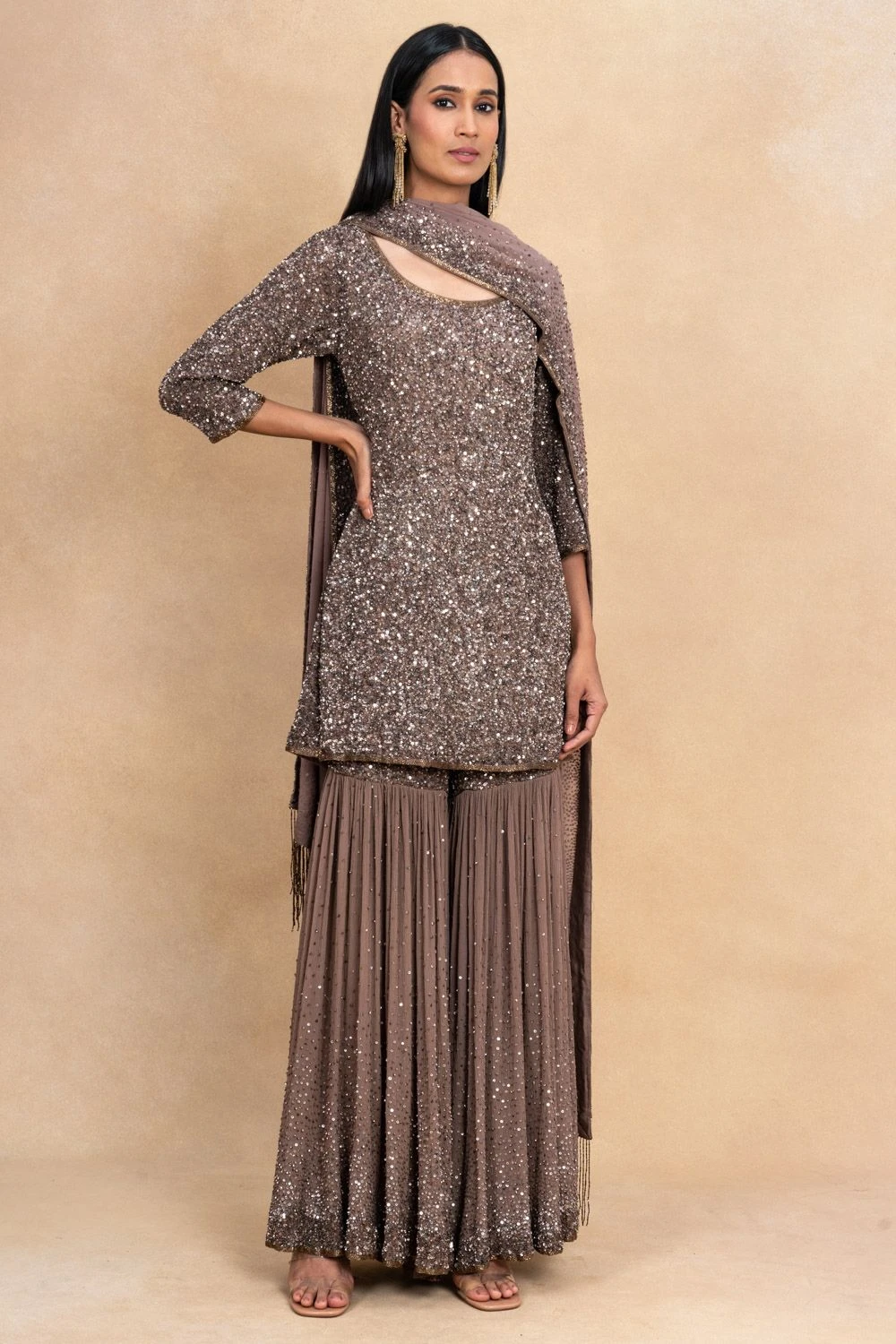This brown sharara set is meant to be a part of your glittery evenings. It is cut in fluid chiffon and enhanced with glinting sequins hand embroidery all across. You can adorn a pair of emeralds for an elegant look.