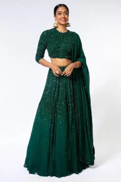 Glam up your sangeet looks in this scintillating emerald green lehenga set. It features a buttoned up sequin embroidered blouse paired with matching lehenga & dupatta. Add a delicate maang tikka to top off your look.