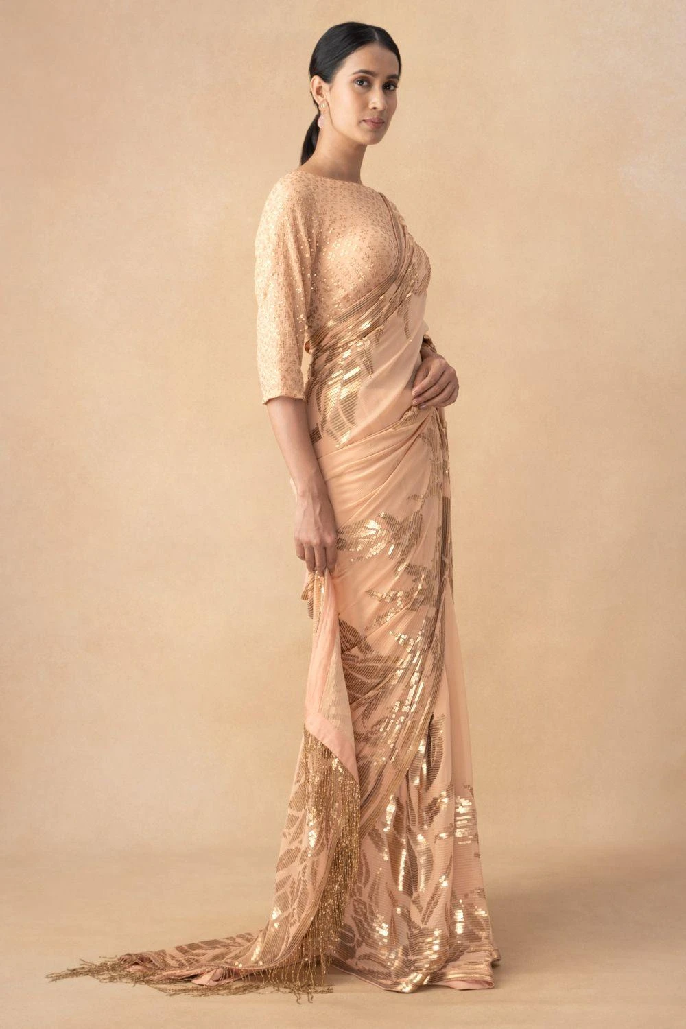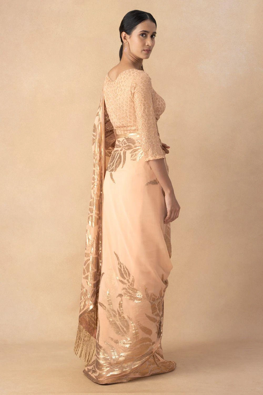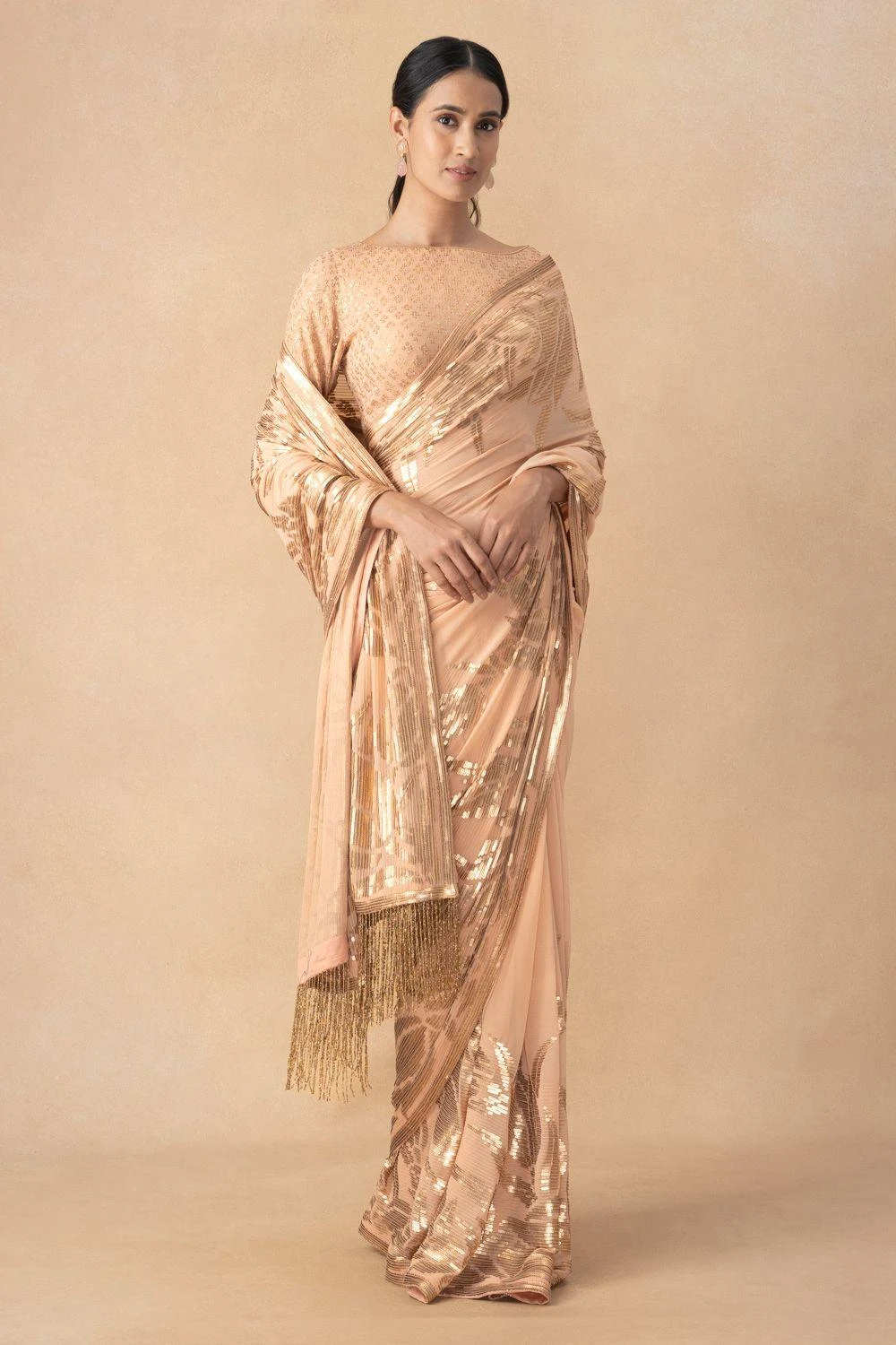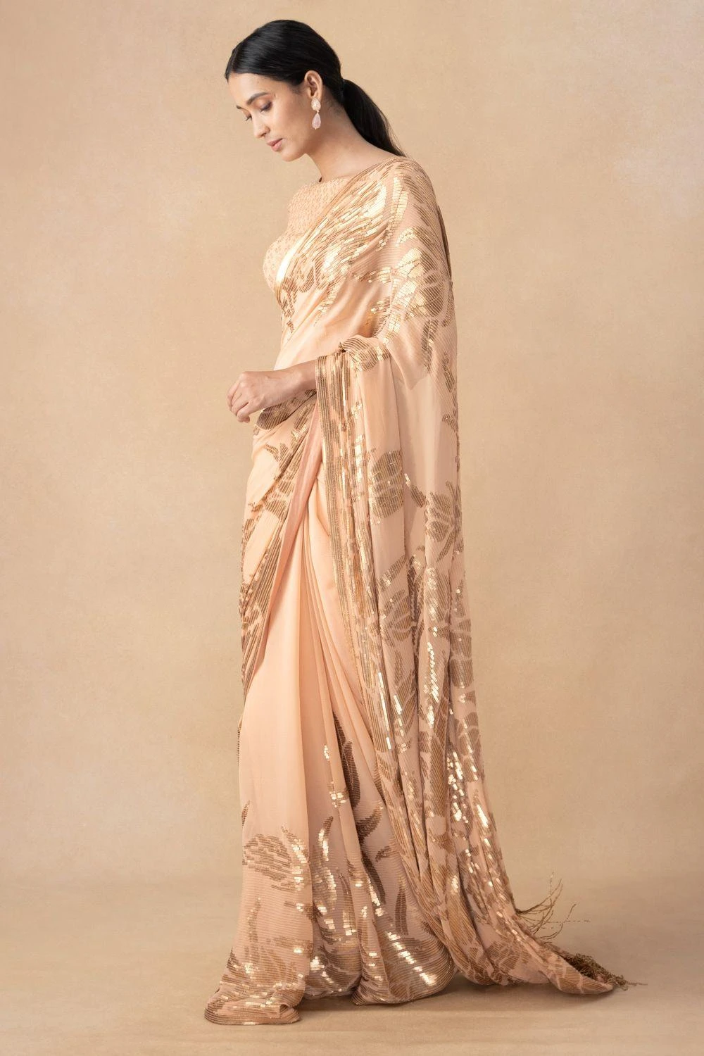 Look effortlessly stylish with this sari set. Crafted in georgette, this set features a sequin embellished striped sari paired with an equally versatile blouse. Add a pair of statement earrings to complete the look