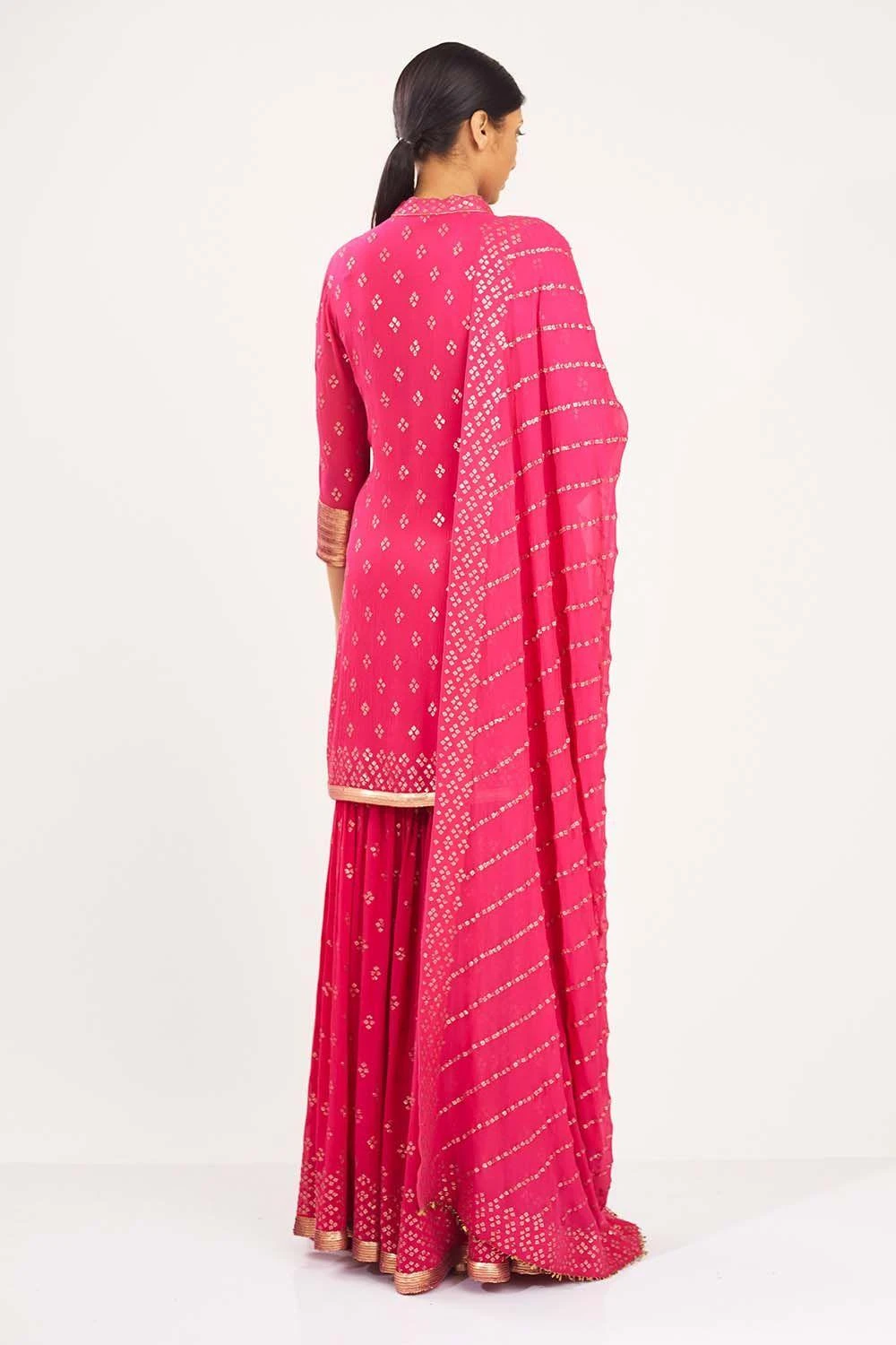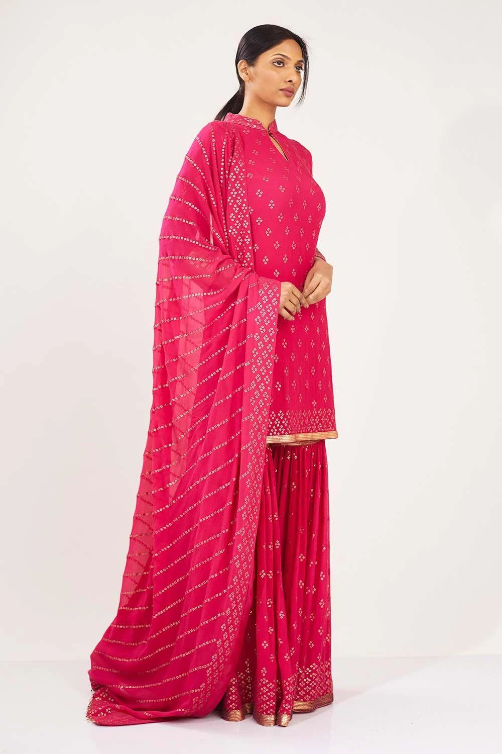 The intricate bandhej sequin embroidery chiffon kurta and sharara paired with a lehriya sequin dupatta is a perfect go to for a destination wedding .