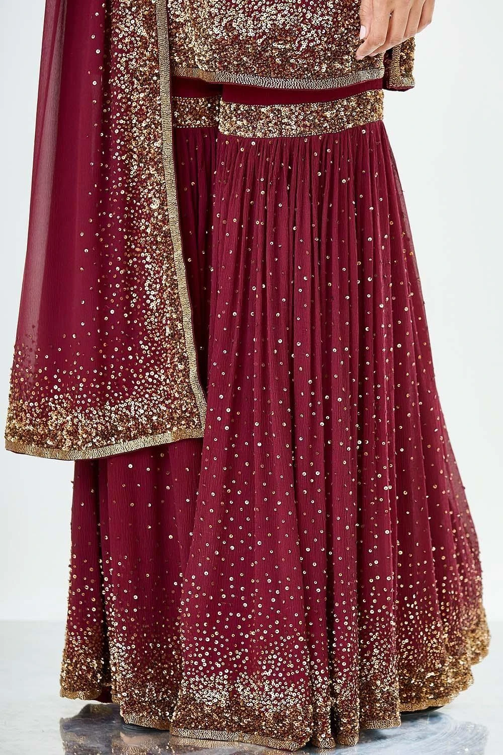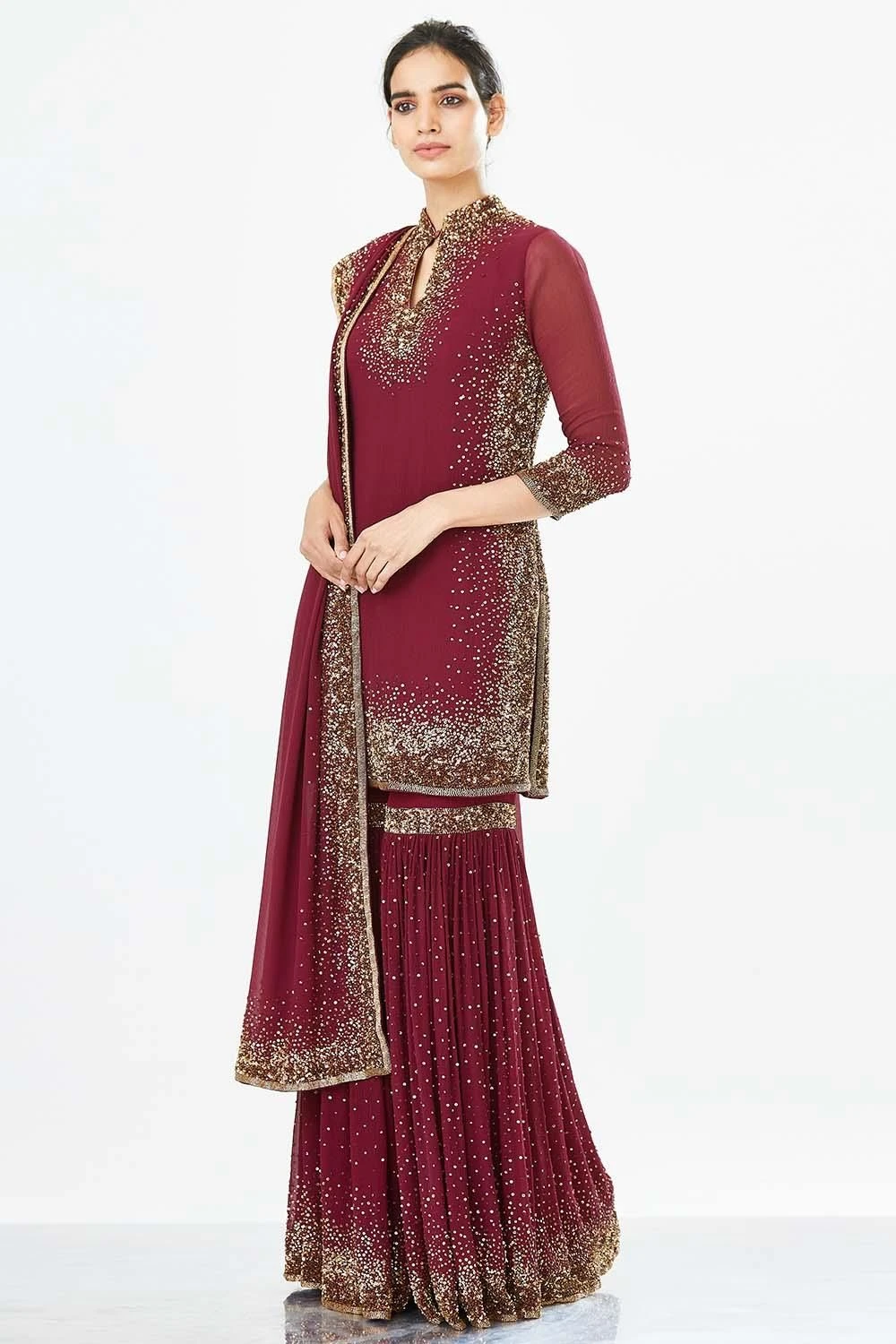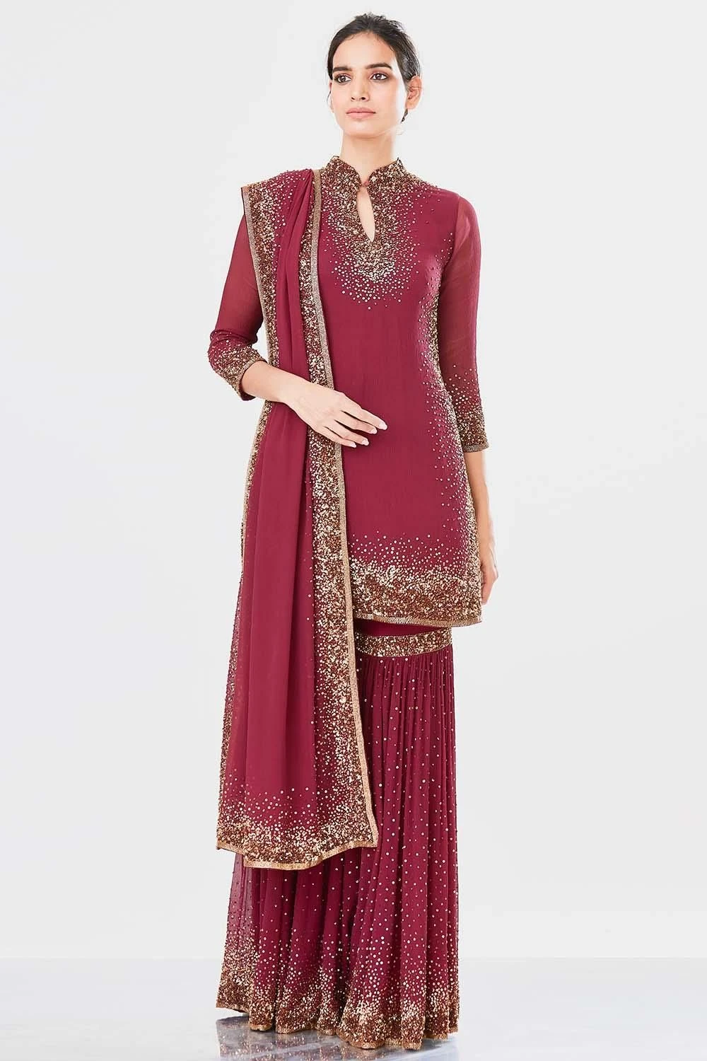 The perfect amalgamation of style & comfort, this set works across occasions. Crafted in chiffon, this set features a sequin embroidered kurta paired with a coordinating sharara and a dupatta. Add a pair of statement earrings to complete the look.