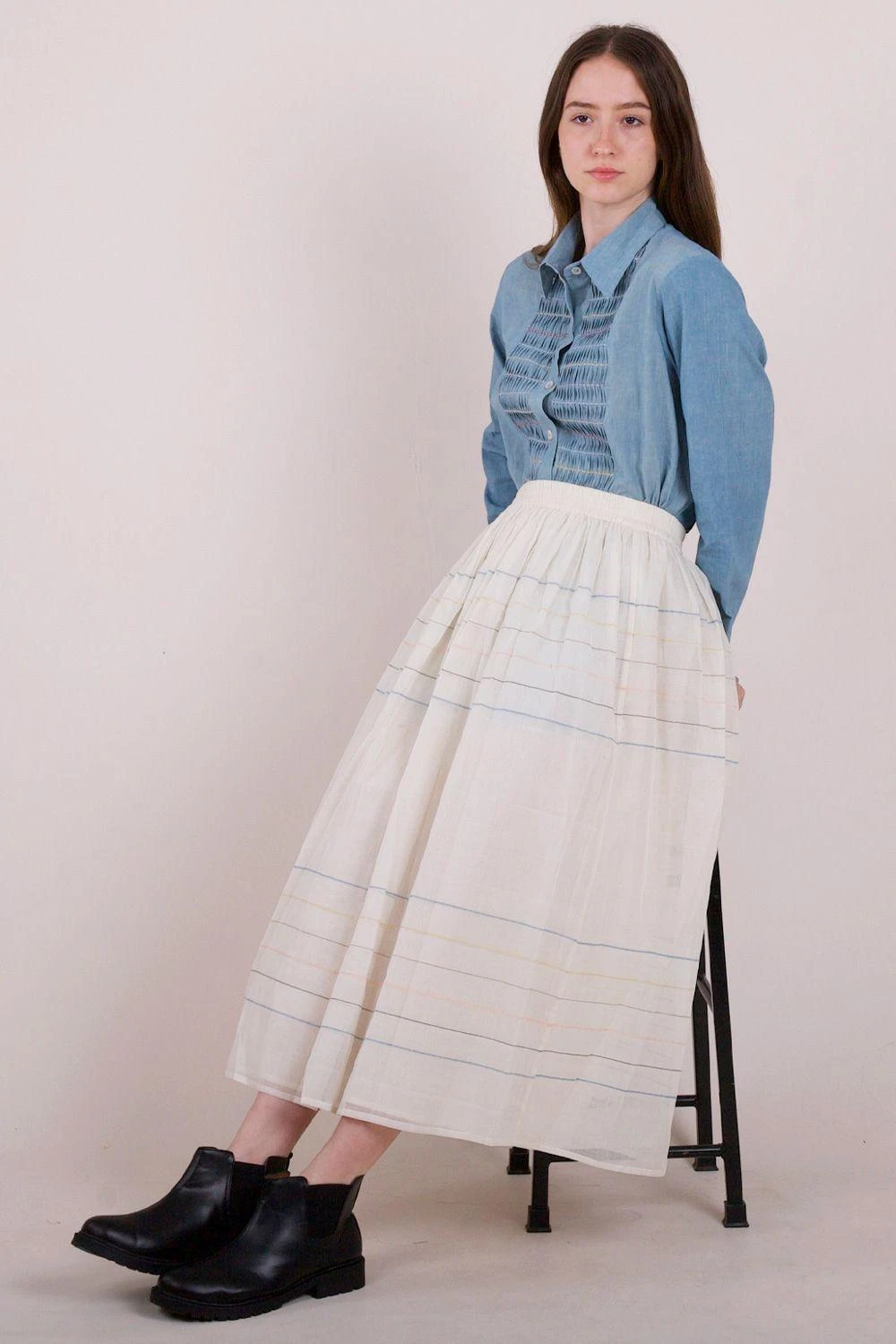 Immerse yourself in the whimsical charm of this calf-length gathered and elasticated skirt. Designed for graceful movement, it invites you to swirl with elegance. Complete with side pockets, it combines style and functionality effortlessly.