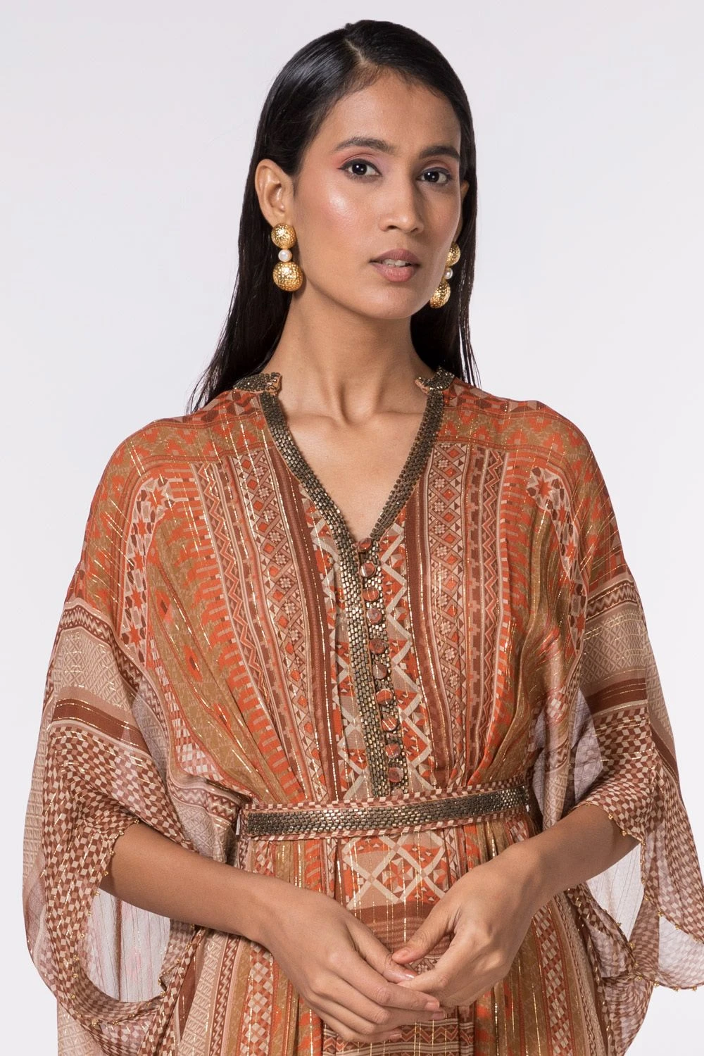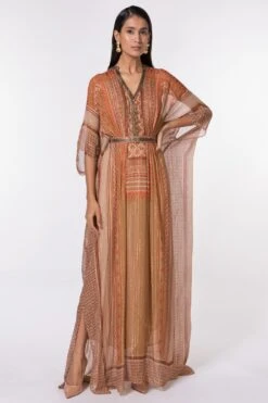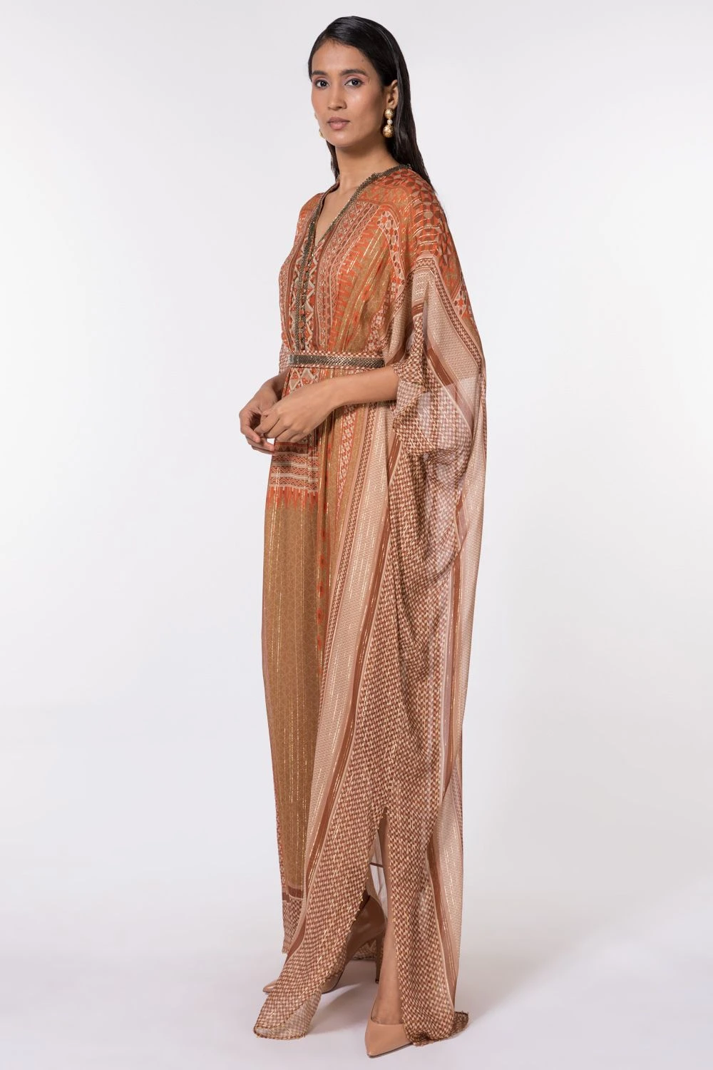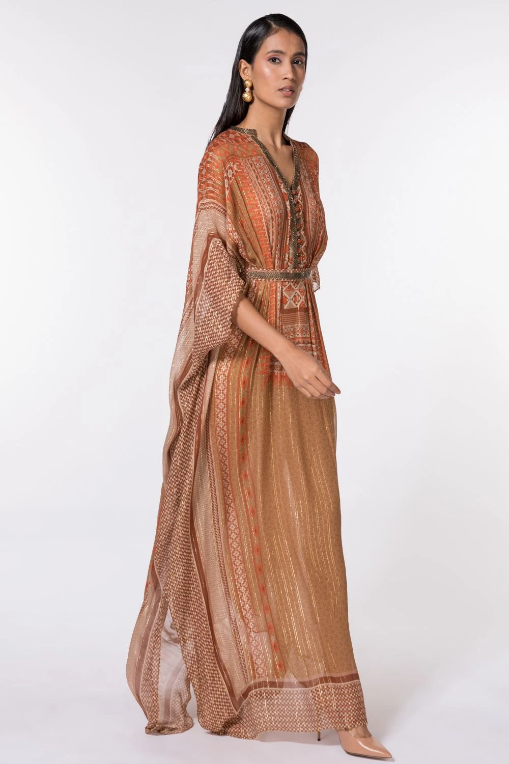Whether for a lunch with friends or an intimate festivity, this kaftan can be worn on countless occasions with equal ease. It is cut in lurex with placement prints and features eclectic embroidery on the neckline. It comes along with a belt & inner.