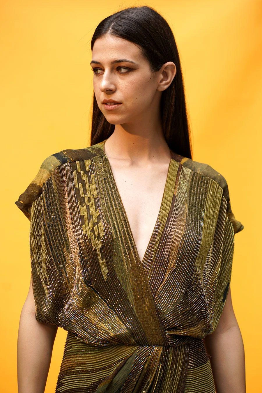 From dramatic Amazonian foliage to bold tribal-esque details, Nikita Mhaisalkar’s runway collection sings the song of the forest and all its life forms. Crafted in chiffon, this overlap dress features African baroque hand embroidered details.