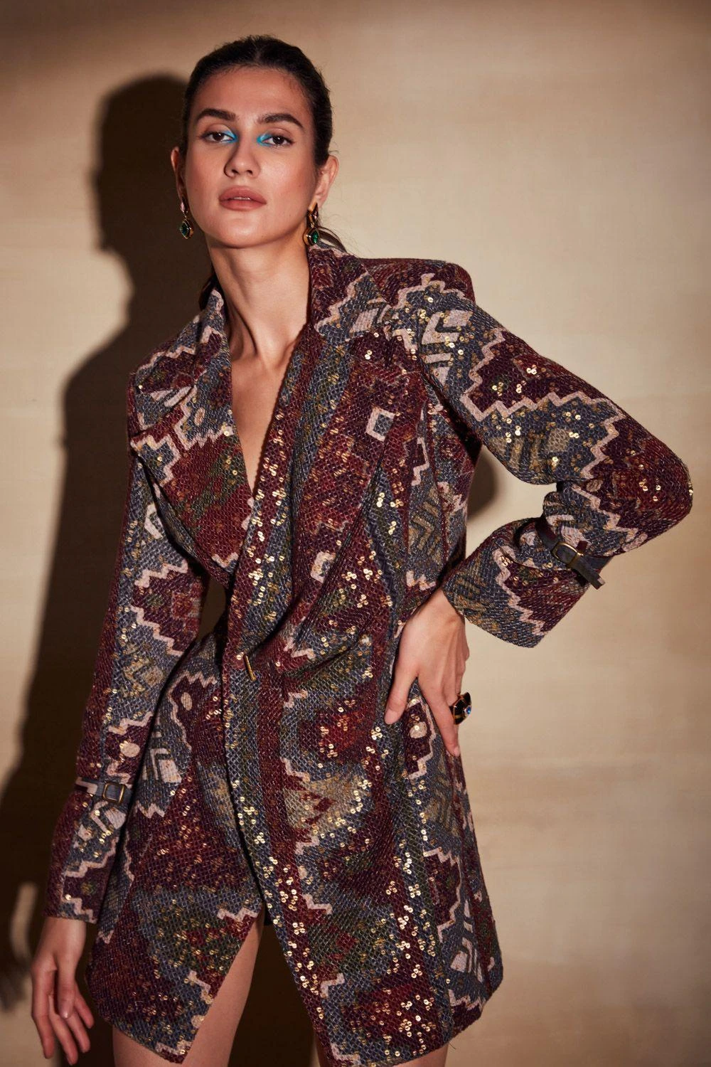 Glitz & glam can’t be justified better than this merlot tapis printed blazer dress. It is cut in sheeted pure georgette in a double breasted silhouette and features belted cuffs. Style it with a pair of metallic heels for an evening soiree.