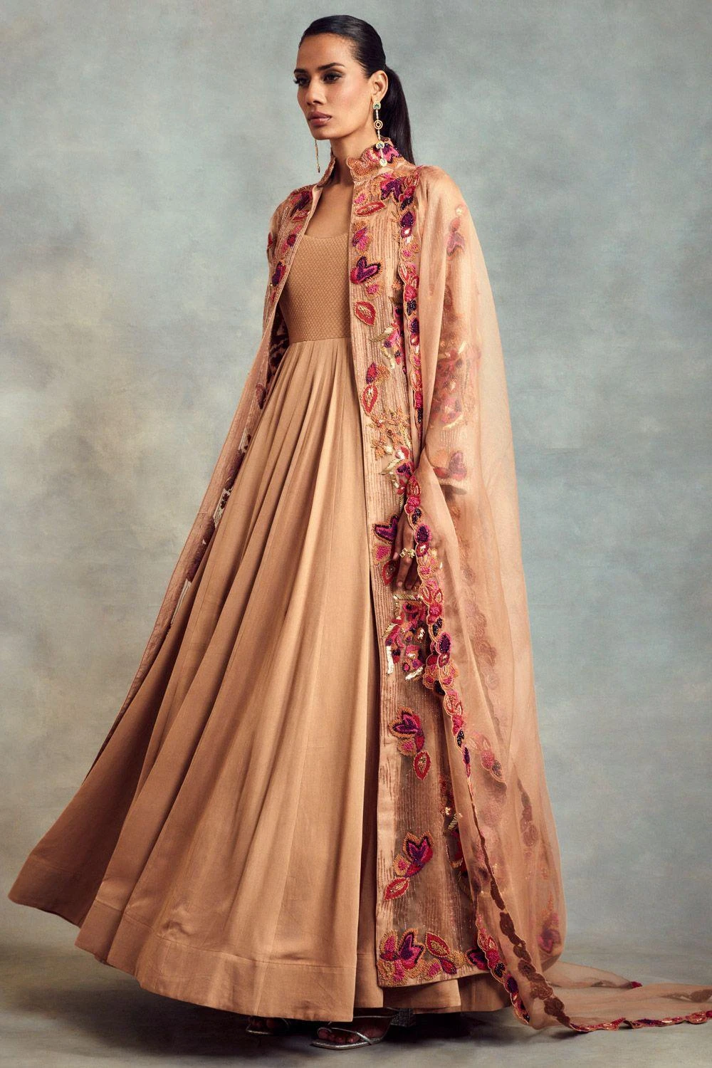 Add a touch of modern glam to your festivities with this peach candy anarkali set. The georgette anarkali & churidar set is elevated with a long jacket with multi-coloured thread embroidery with embellishments and also comes with a dupatta.