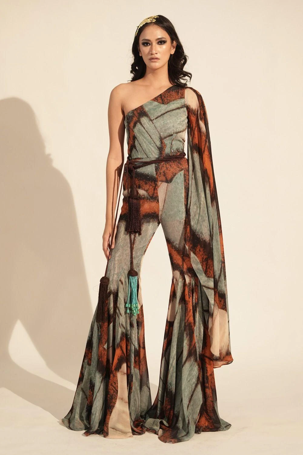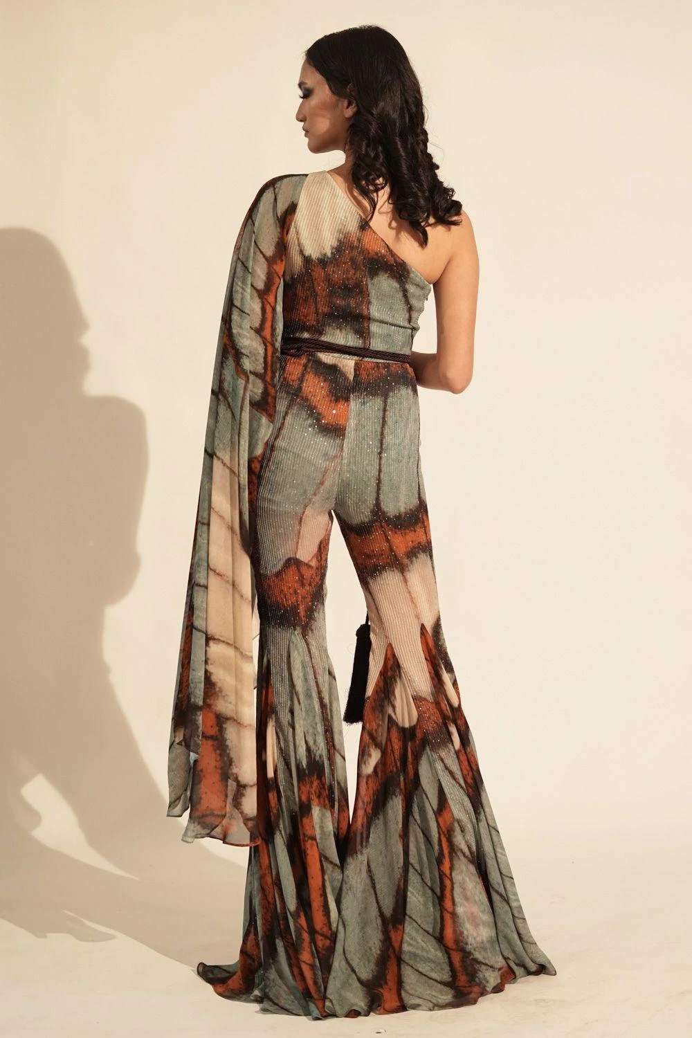 Look effortlessly stylish with this cape style jumpsuit. Crafted in georgette, this one shoulder jumpsuit features an abstract butterfly print all over. Add a pair of dangler earrings to complete the look.