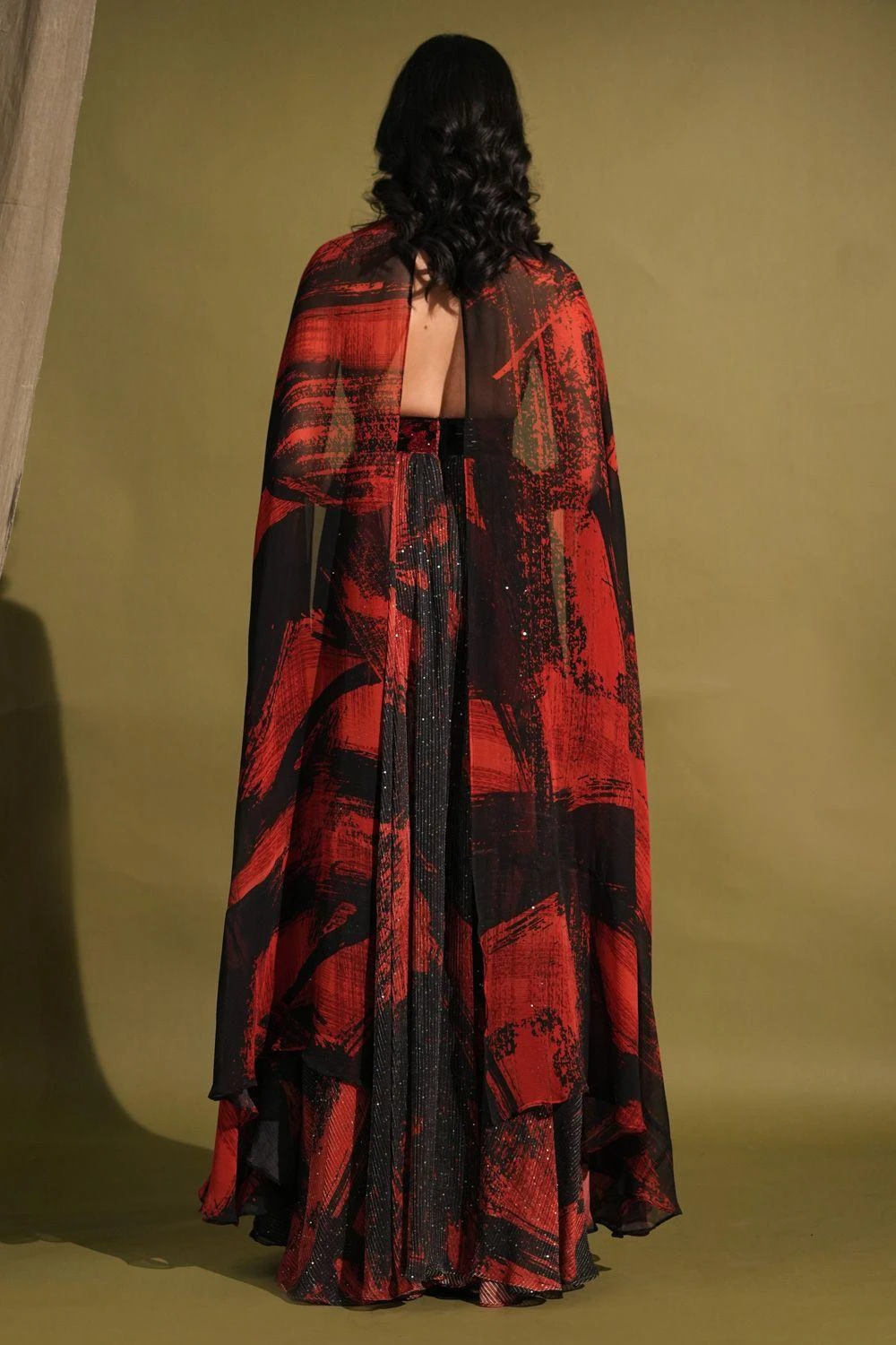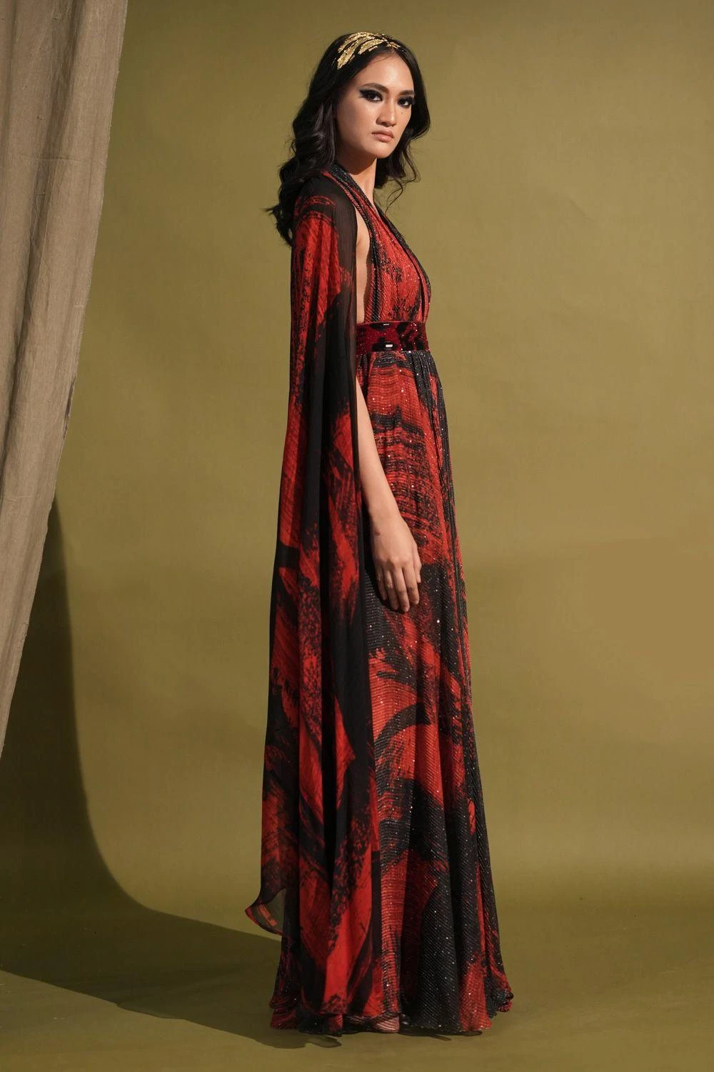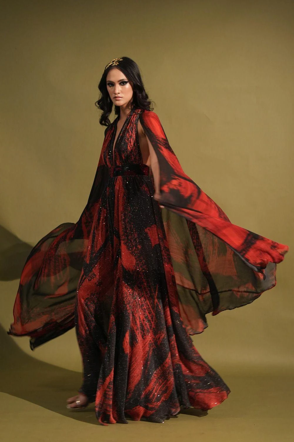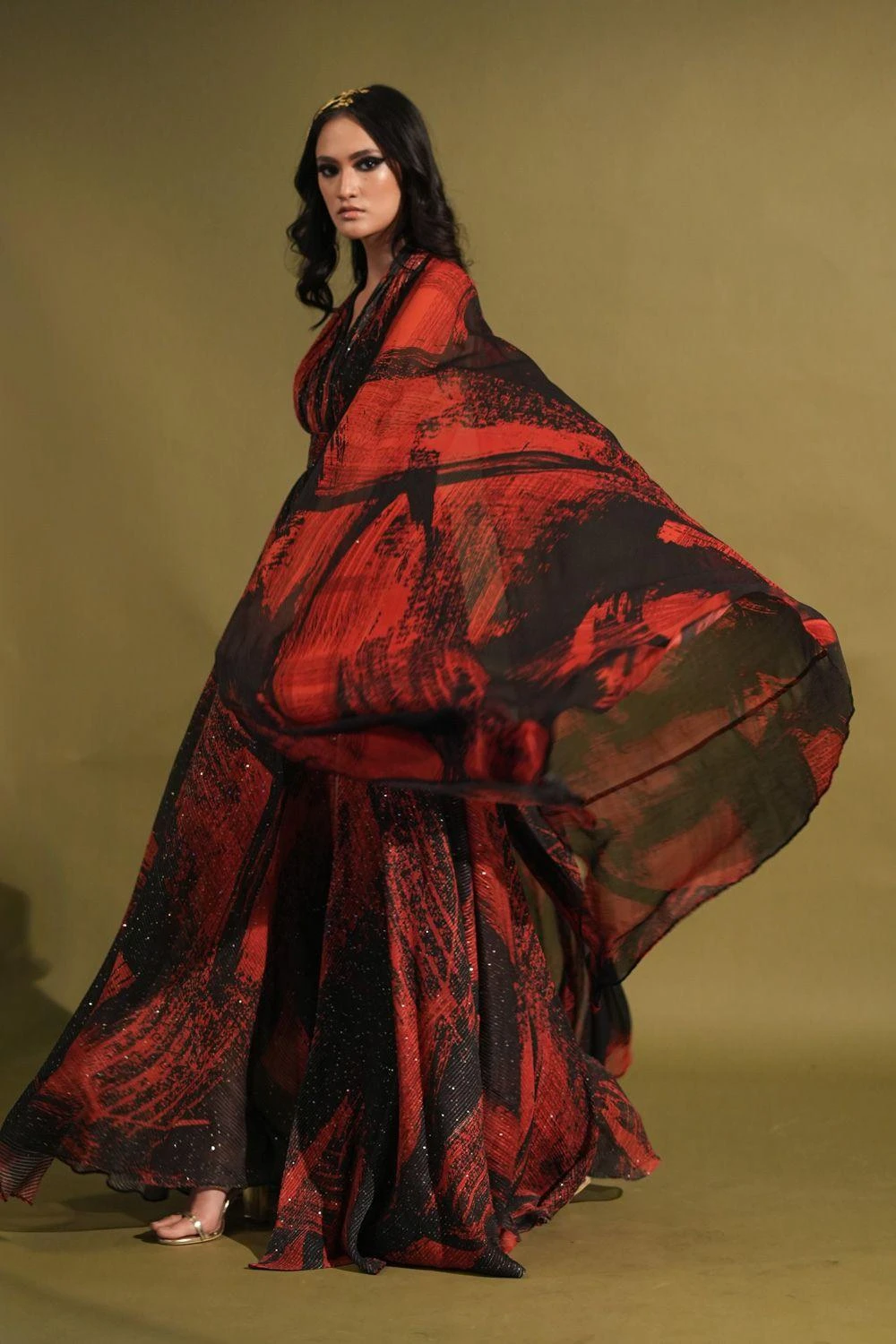 Make a statement in this red and black stroke print maxi dress with flowy sleeves adorned with elegant glass bead embellishments. This exquisite ensemble combines boldness with grace, ensuring you stand out at any event.