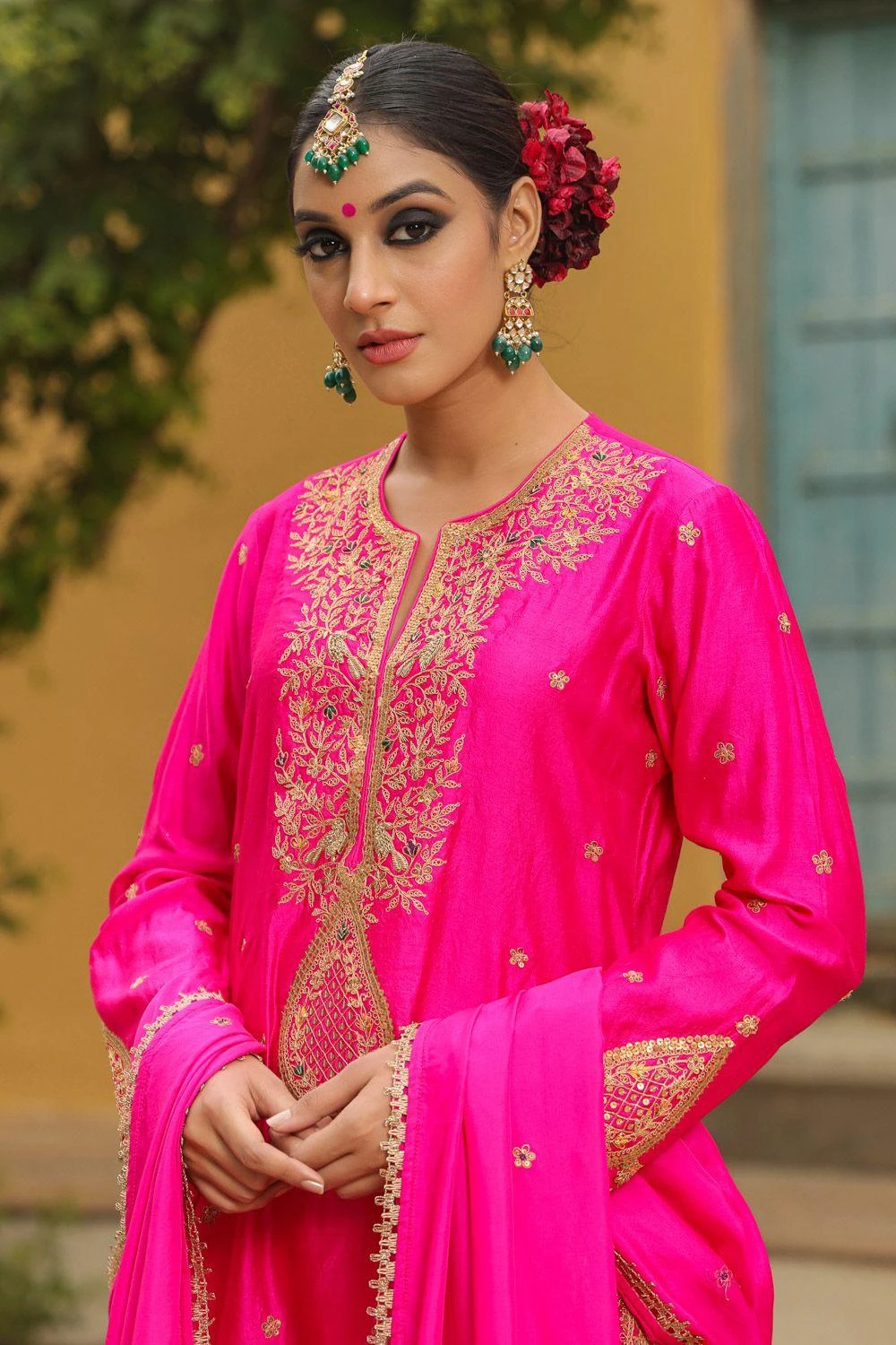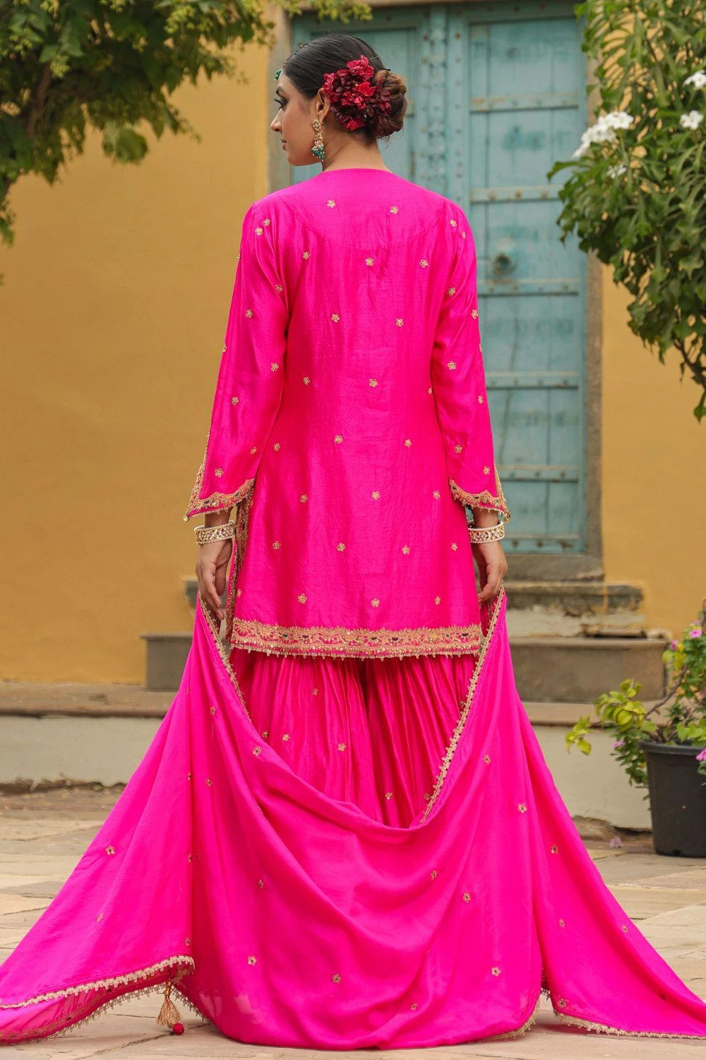 Dive into opulence with this sharara set. Intricate embroidery featuring zari dori, vibrant resham, and dazzling tikkis adorn the ensemble. The spiral design on the sleeves and captivating buttis on the sharara, define exquisite craftsmanship.