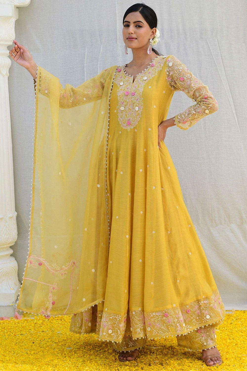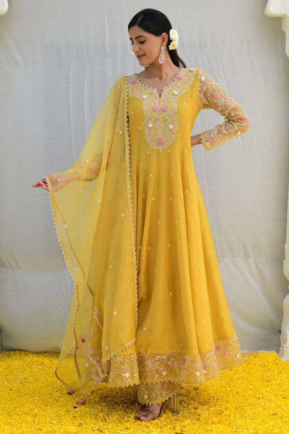 The perfect amalgamation of style and comfort, this anarkali set is perfect for daytime festivities. Crafted in silk, this set features a floral embellished kurta, sprinkled with dori dots paired with a coordinating palazzo & dupatta.