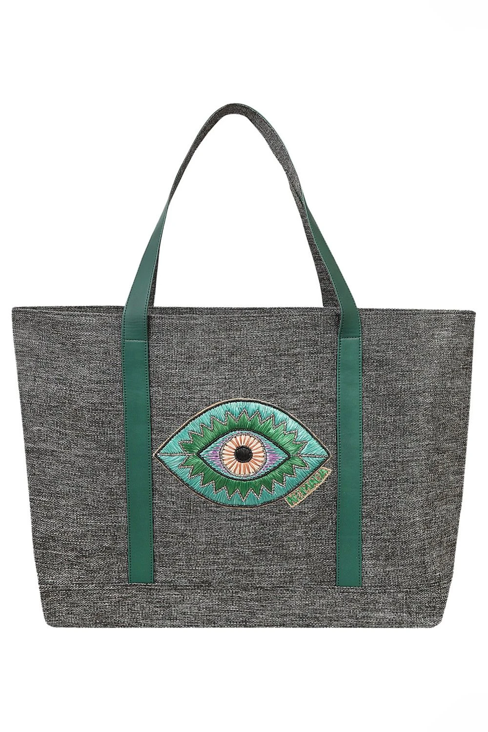 This tote bag can hold pretty much anything. Crafted in jute silk blend this bag is embellished with an evil eye motif on the front. Carry this piece with style to work, shopping or to your beach getaways.