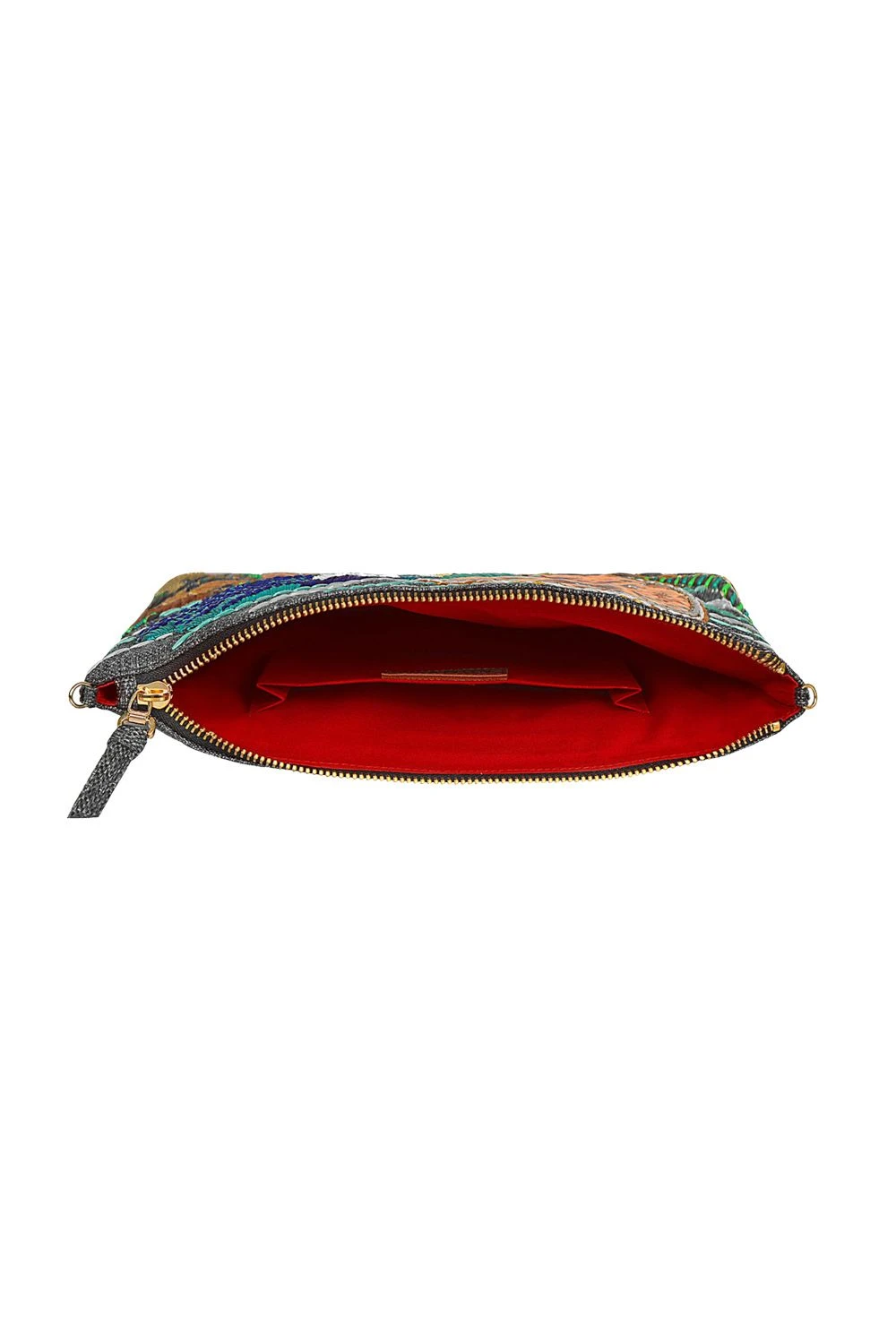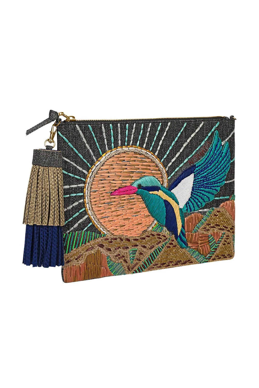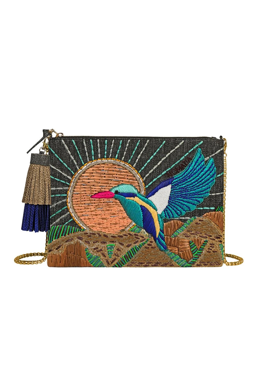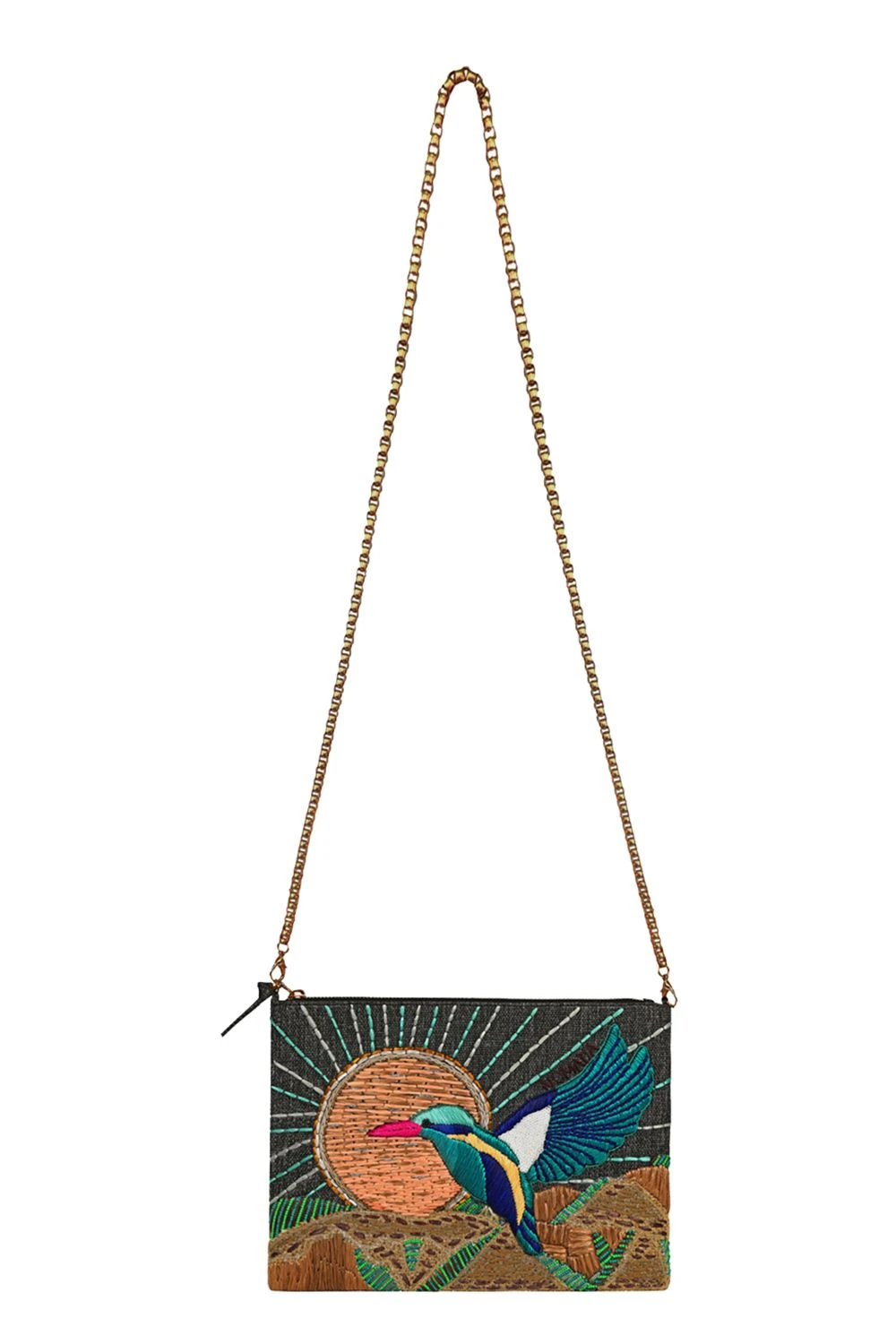 Add a fun contemporary twist to your look with this quirky arm candy. It is hand embroidered with bead work and features intricate detailing among the foliage and on the beautiful bird itself.