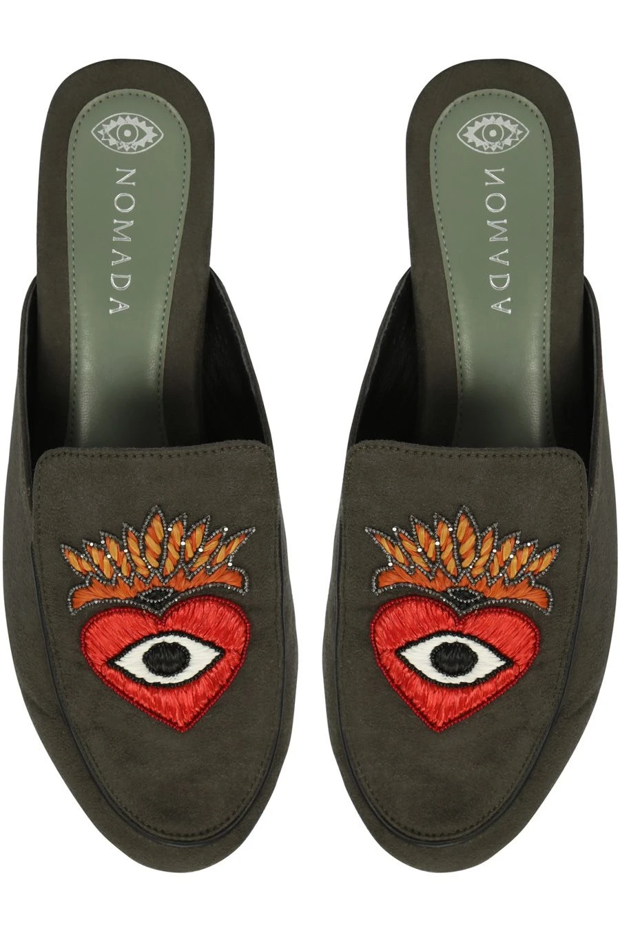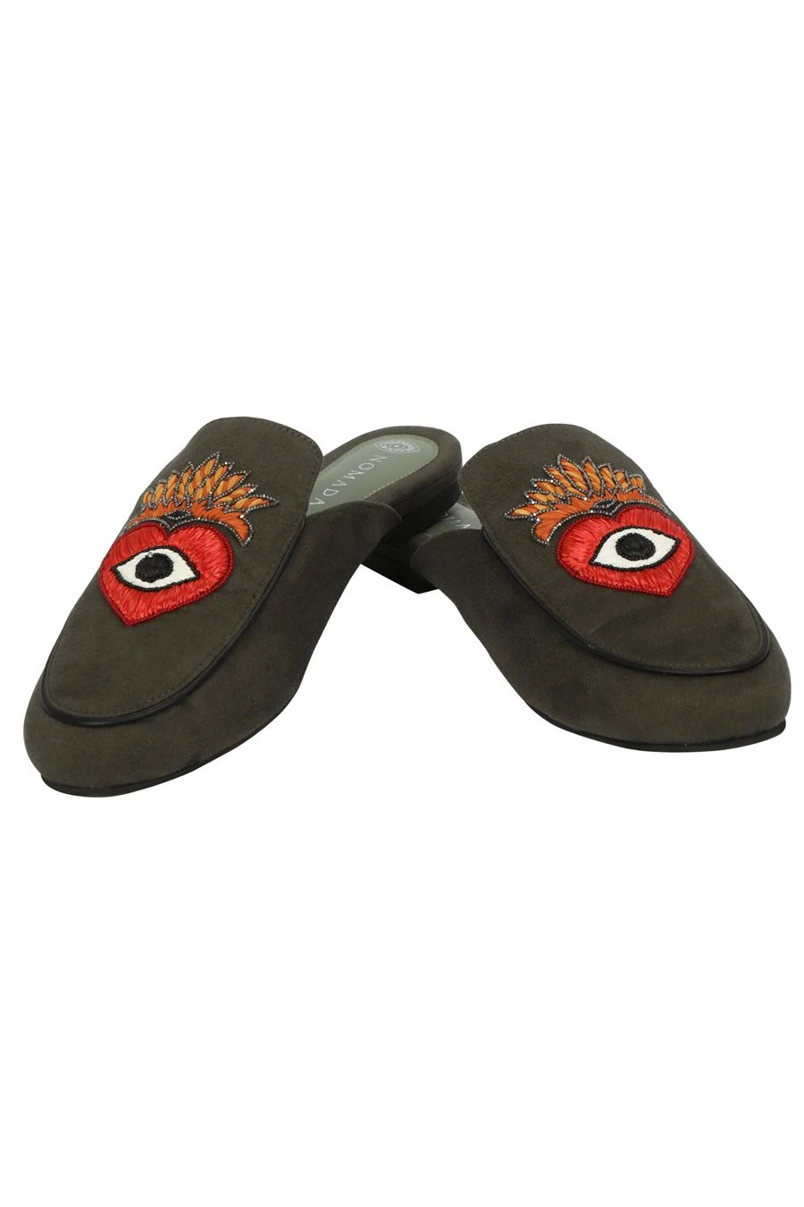 Gorgeous hand embroidered heart eye patches on a delectably soft suede base make these mules a real conversation starter. You can team these raffia embellished mules with both Indian & contemporary looks.