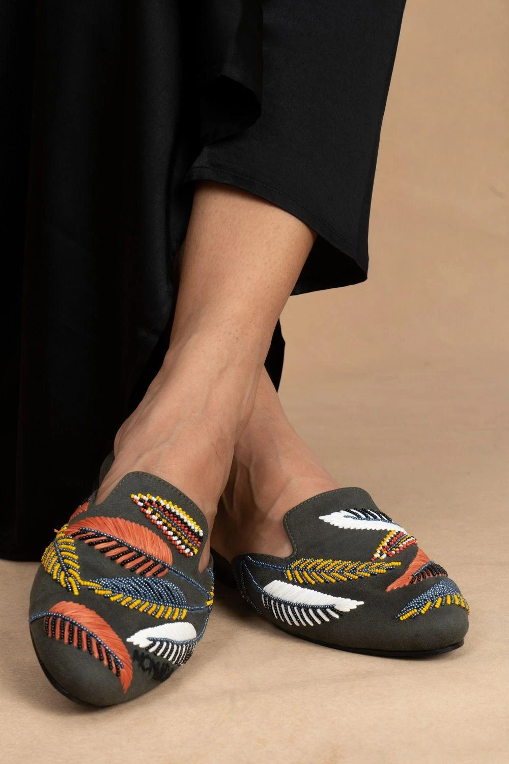 Inspired by the detail and beauty of palm leaves spread on a soft suede base, these are a pair of luxe statement shoes that are resort ready. You can team it up with both Indian & contemporary looks.