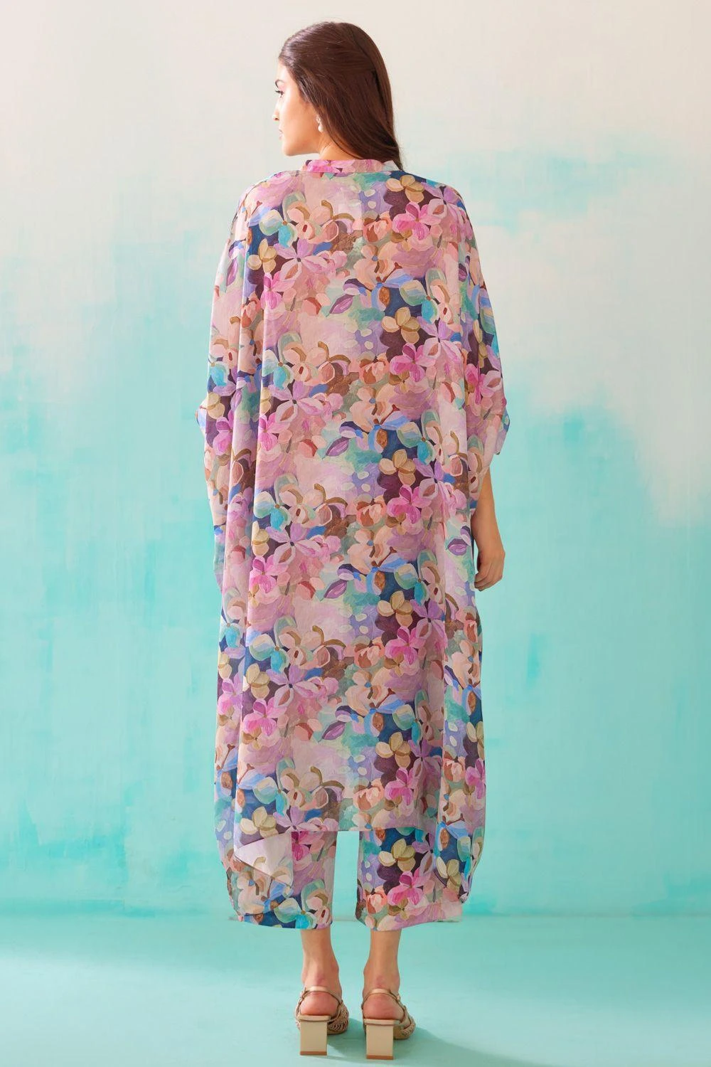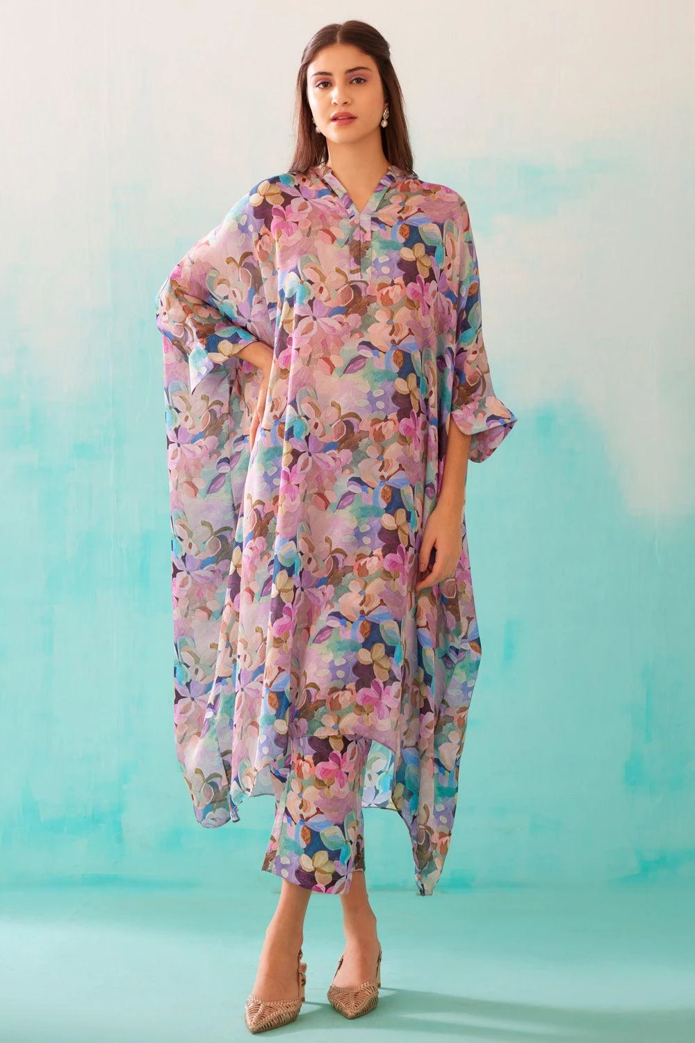 From your work desk to the brunch table & from lounging at home to catching flights, you can always count on this kaftan. Crafted in satin georgette, this tunic features an abstract print all over.