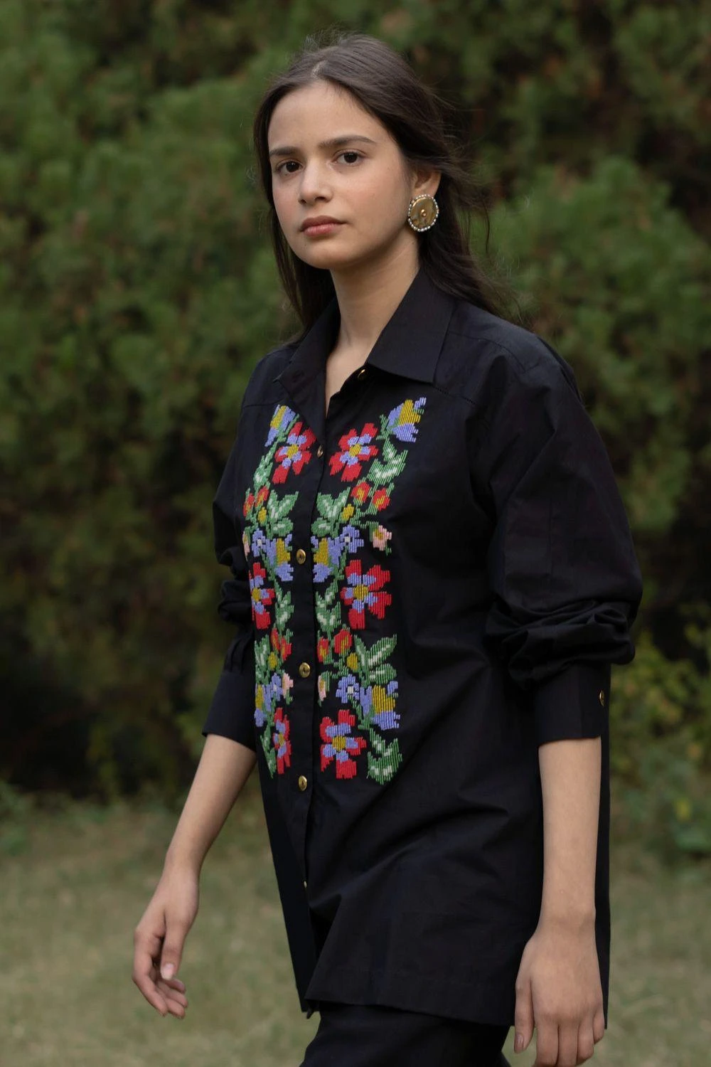 In the realm of opulence, the floral cotton poplin shirt, a statement adorned with hand-beaded Runn-inspired embroidery. Versatile for denims, skirts or traditional drapes. Perfect for enchanting parties and dreamy dates.