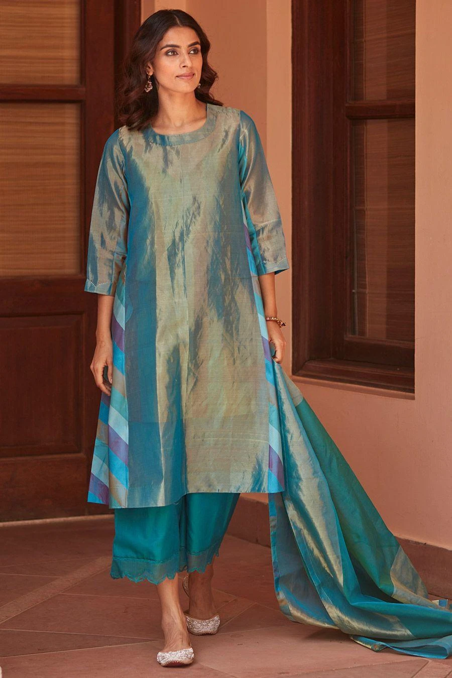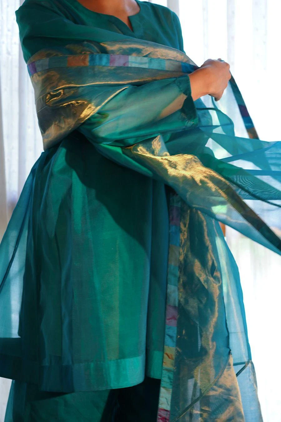 A festive must-have, the Megh Odhni features panels of tissue with an edging of handwoven pachranga silk created by artisans in Banaras. Layer it over a coordinating kurta & bottoms from the collection to complete the set.