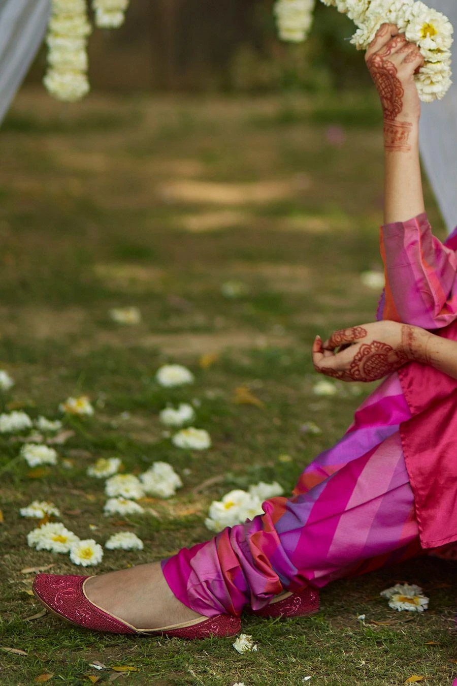 This Rani pink churidar crafted in Pachranga silk is painstakingly handwoven by artisans in Benaras with a specialised dyeing & warp preparation where the yarn is divided into five equal parts, each of which is dyed in five different colours.