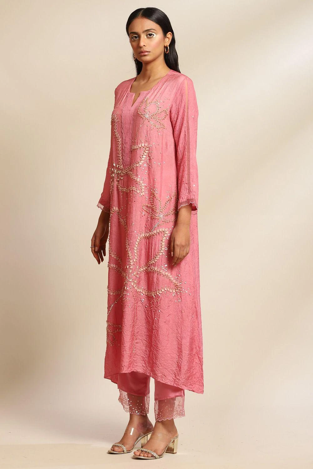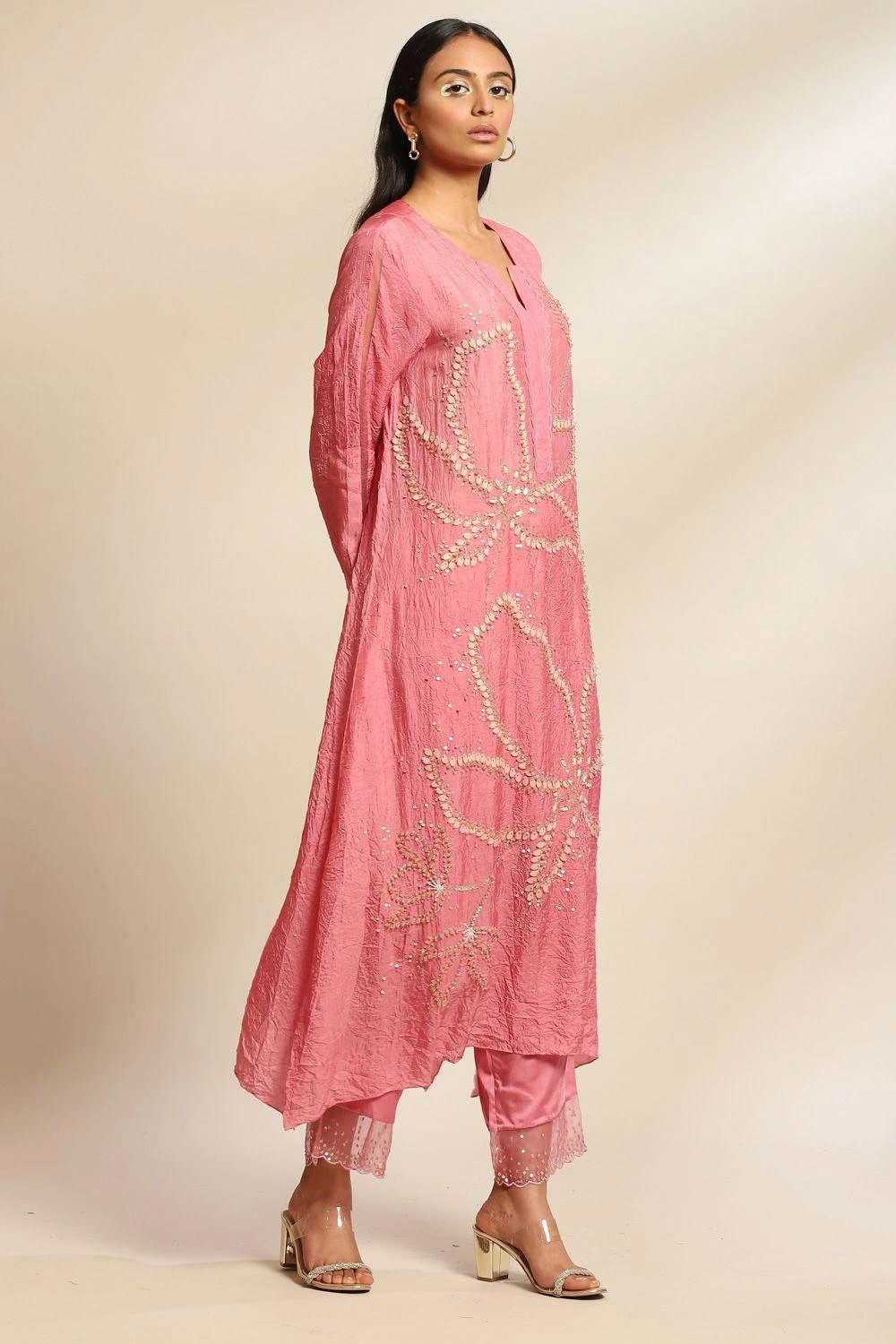 Step into elegance with this floral viscose printed silk kurta. Its floral embroidery, adorned with sequins and beads, creates a captivating allure. Add a pair of statement earrings to complete the look.