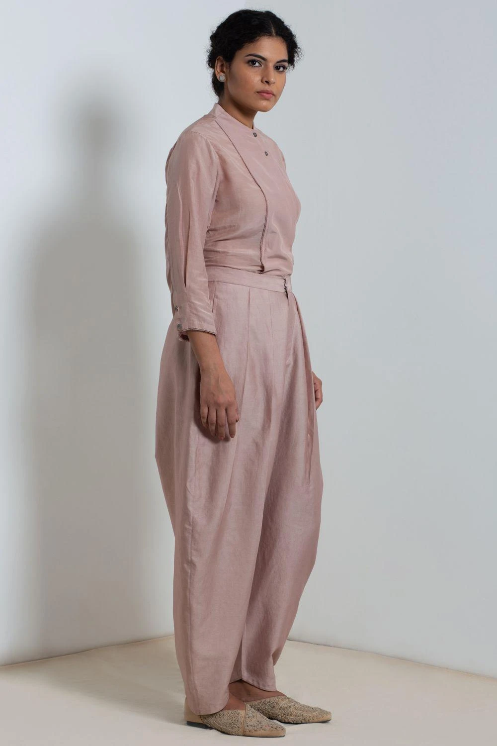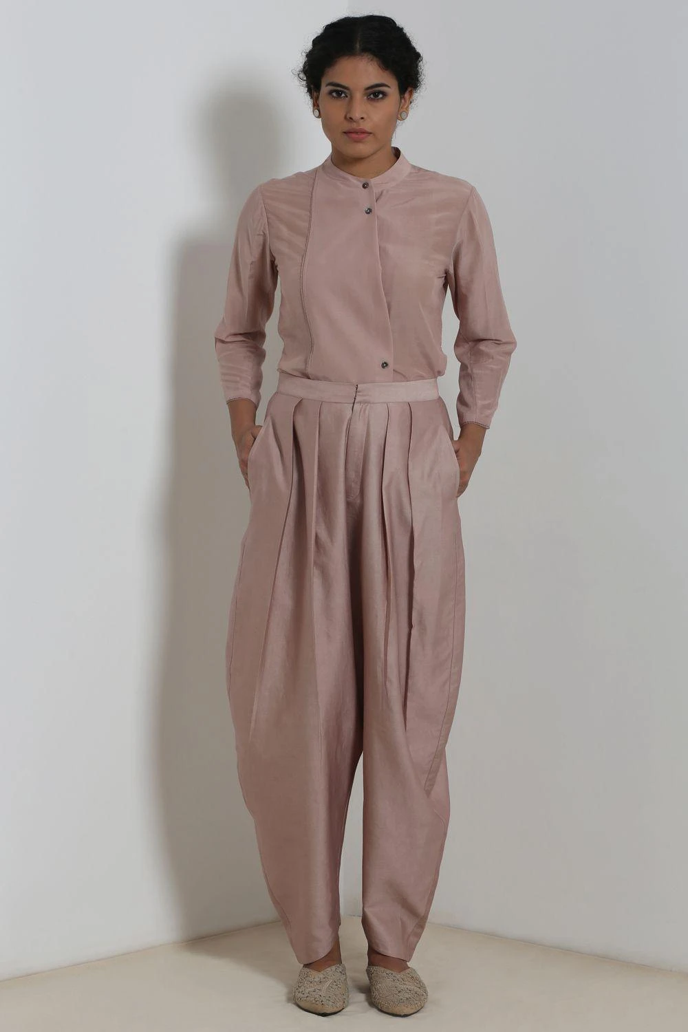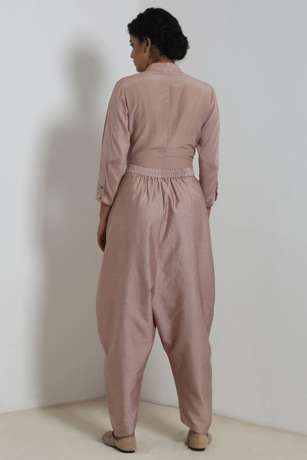 These opal dhoti pants are comfy & versatile, a staple worthy piece. These are cut in satin chanderi fabric and feature a drop crotch detail. Style them with your shirts or tunics.