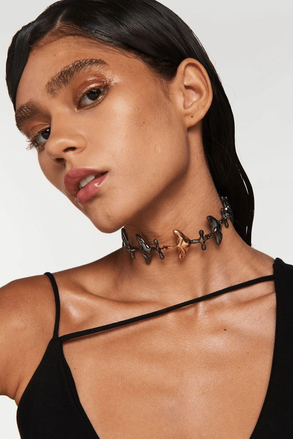 Striking the perfect chords between craftsmanship & an edgy ultra-modern design, this choker in dual tone finish is an iconic design. Crafted in 22 KT gunmetal finish, the necklace features gold highlights that seamlessly blend with the design.
