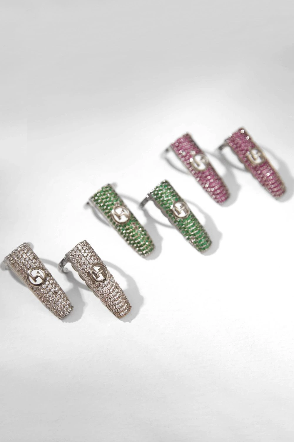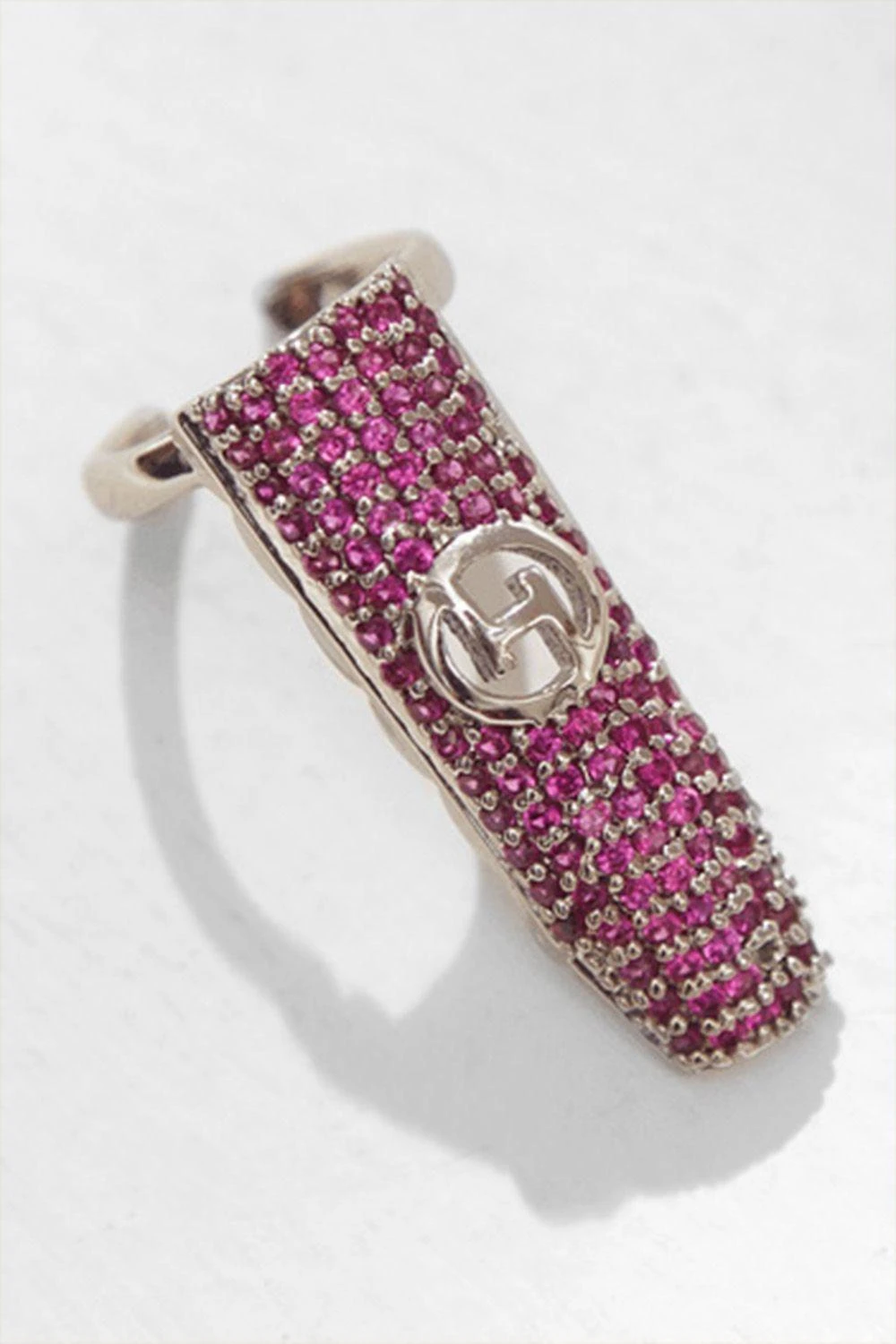 Evoking a modern and bold allure, the jewelled monogram fingertip ring in fuchsia pink feature a sparkling finish in meticulously hand set zircon, The nail caps highlight the monogram of the house with an embellished ring.