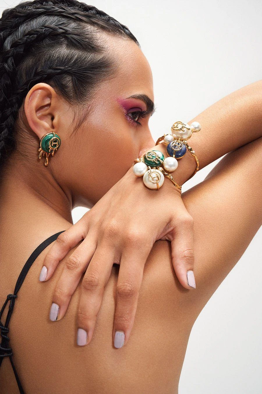 Carefully crafted with pearls, lapis and machalite stones, this hand cuff presents a statement look every time it’s worn. Style it solo, for its ineffable quality echoes. The base metal is plated with 22K gold and ensures a snug and comfortable fit.