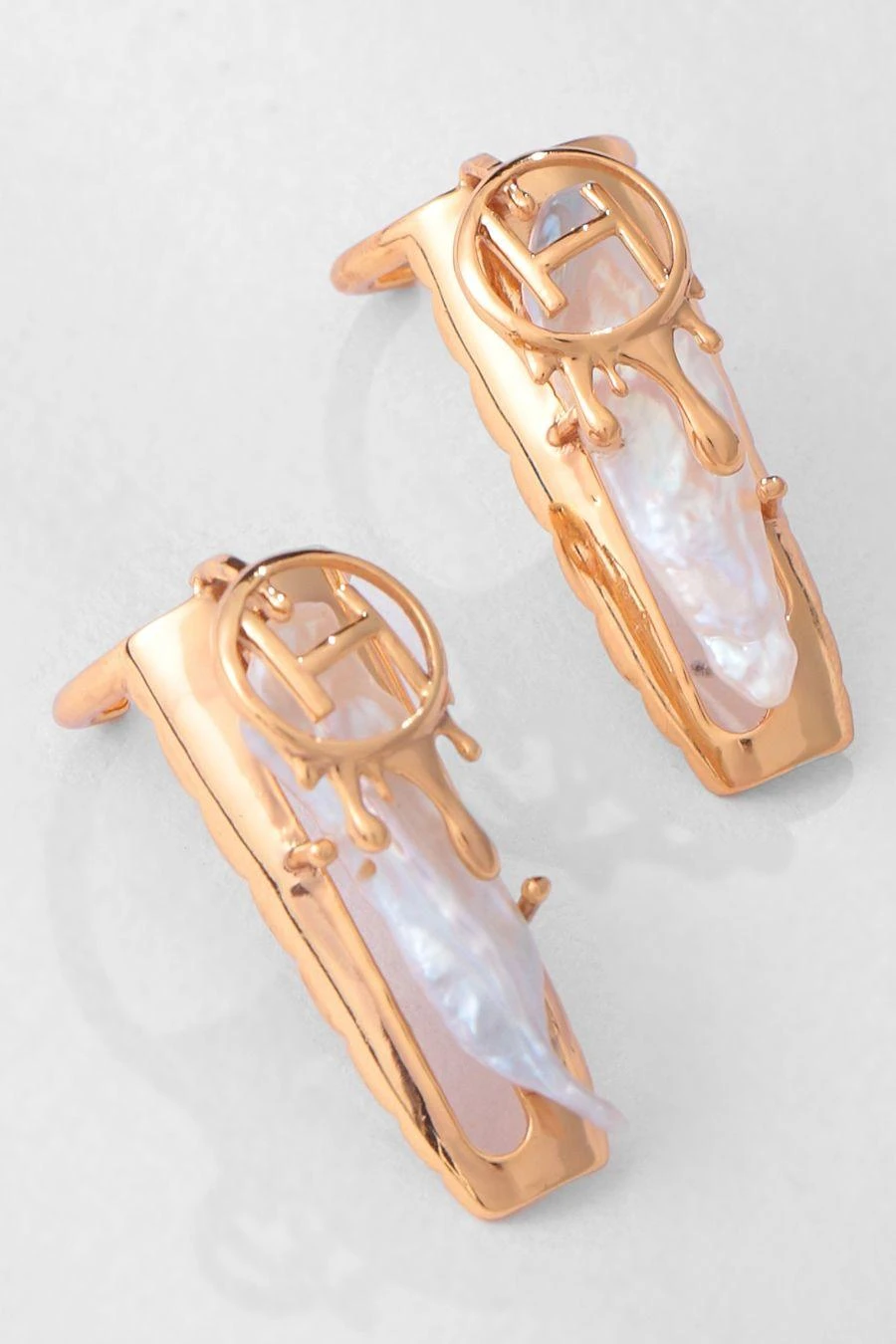The pearl fingertip ring in Gold in a classic 22KT gold finish is enhanced with keshi pearls set in a similar dripping effect that adds a scintillating charm when worn on the nail.