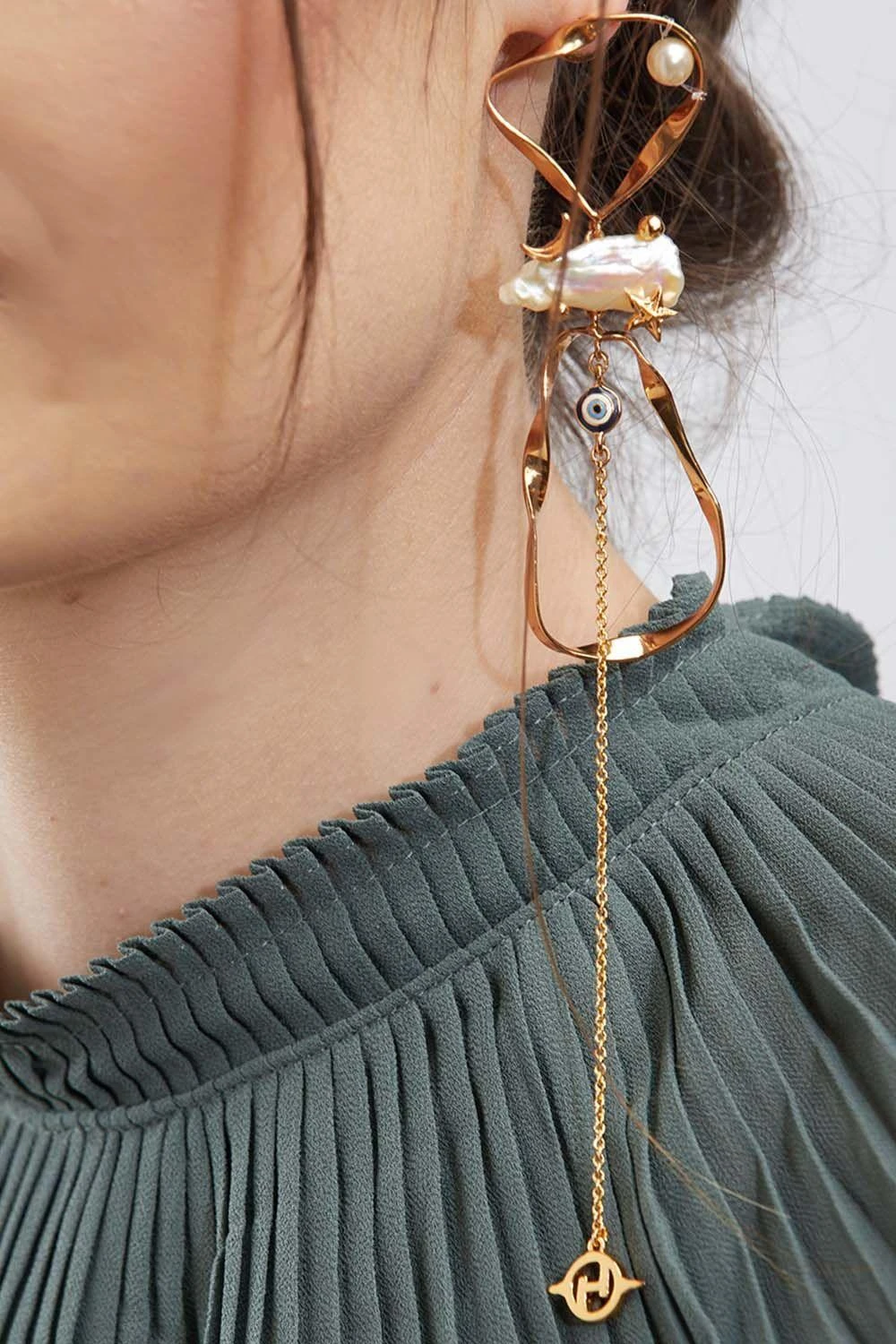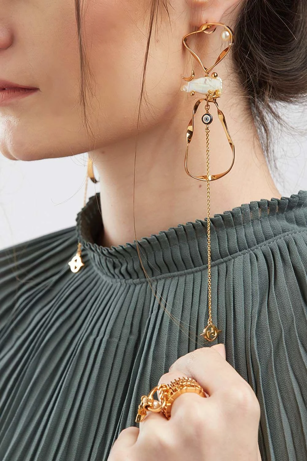 These stunning dangler earrings are studded with pearls & delicate evil eye charms.