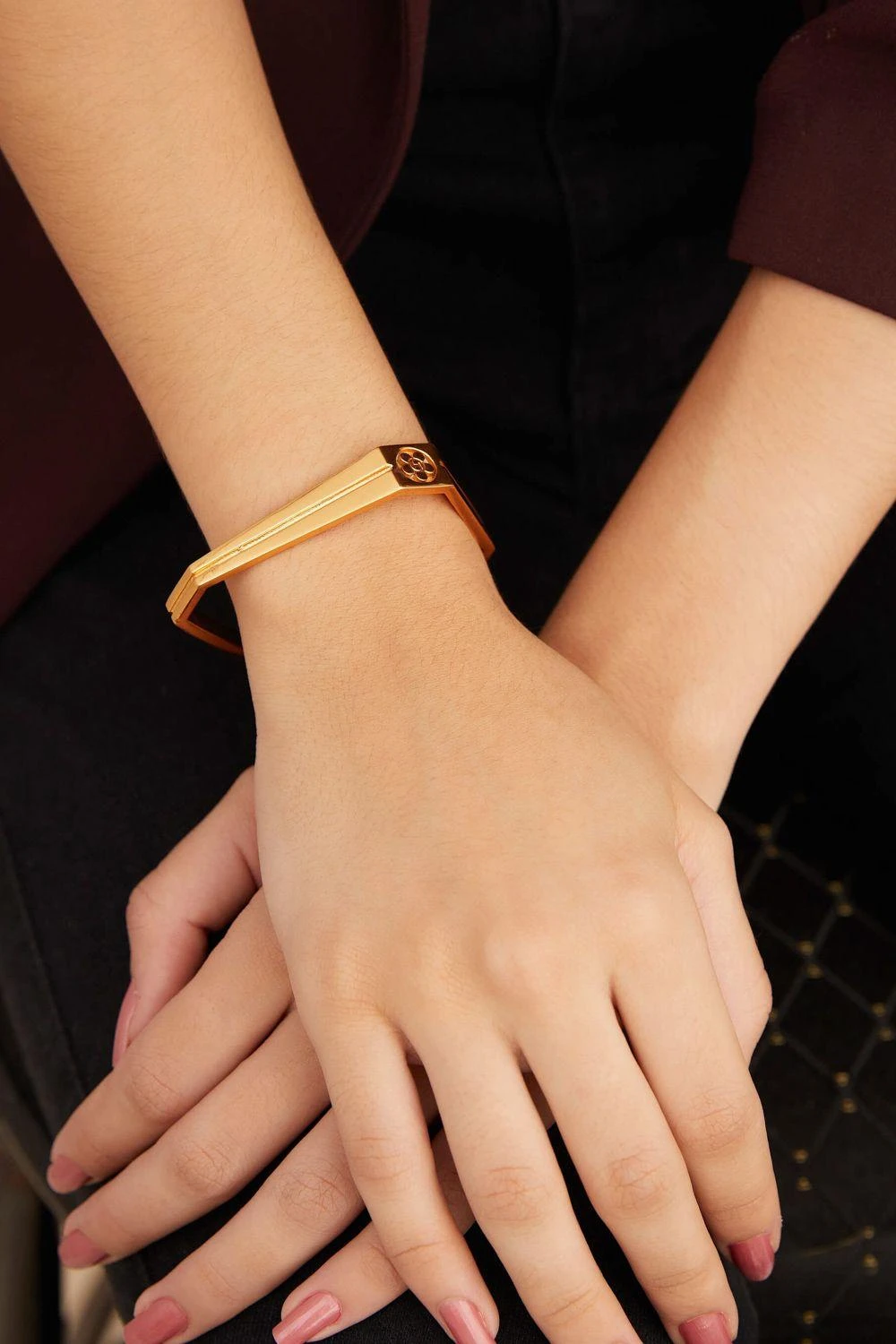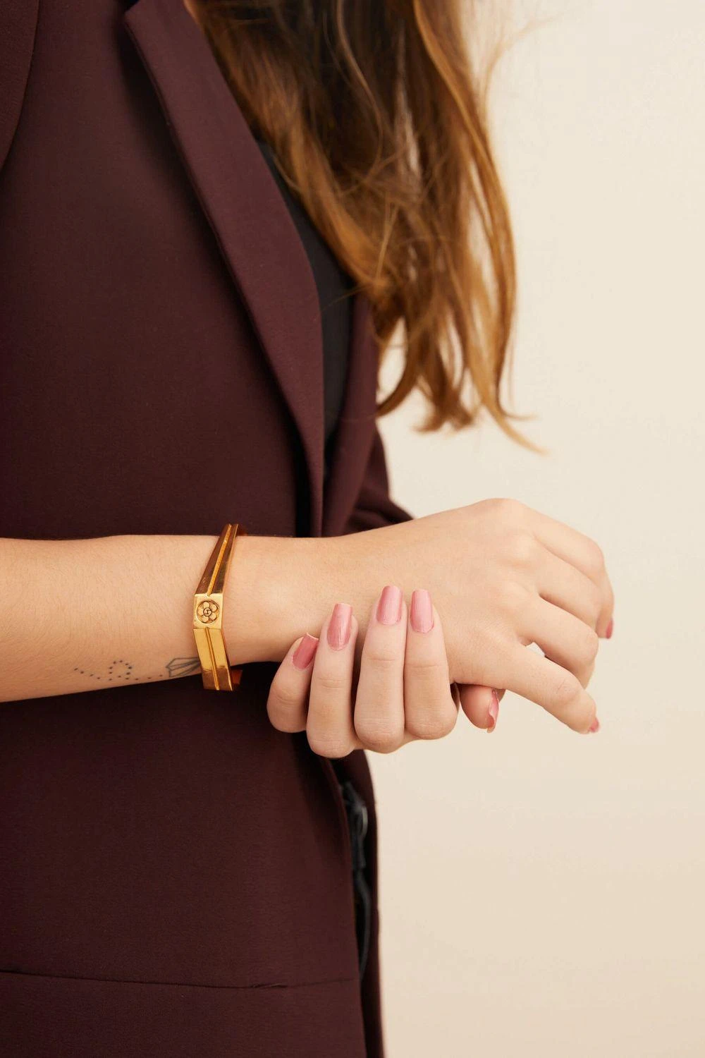 Bringing together an industrial rawness with striking simplicity, this OH poppi bold handcuff is effortless as it is timeless. This 22K gold finished piece is designed for comfort & everyday aesthetic.