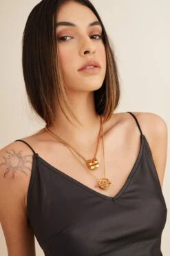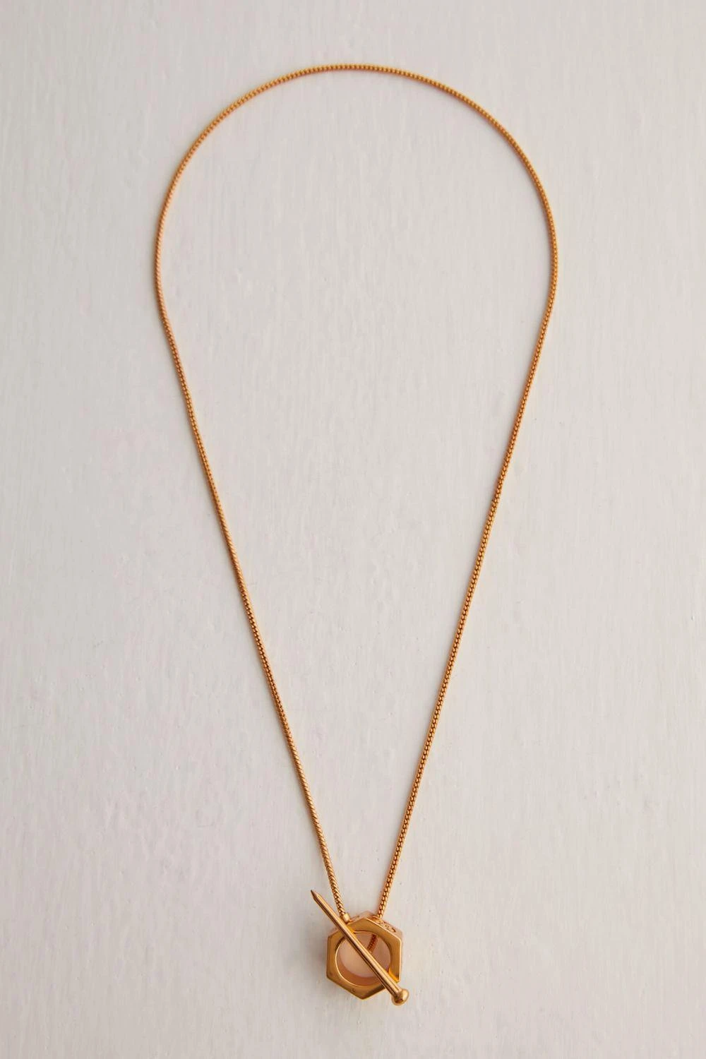 This one of a kind OH poppi bolt-t pendant necklace features a structural construction of a 22K gold finish bolt, beautifully cushioning a T-shaped hardware atop it as a play on shape. Style it solo on your neck and let it shine.