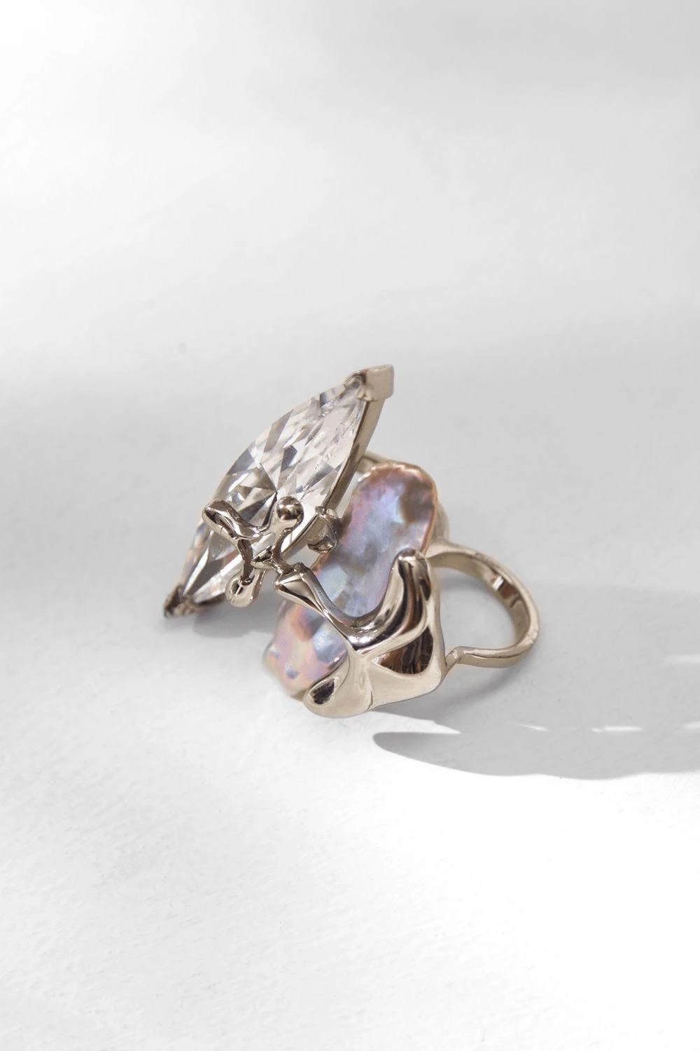 These earrings are embellished with Keshi pearls and Swarovski marquise stones, the creation is casted in 22 KT silver finishing that perfectly wraps around the finger to complement the essence of the wearer.