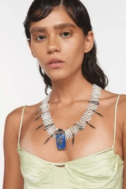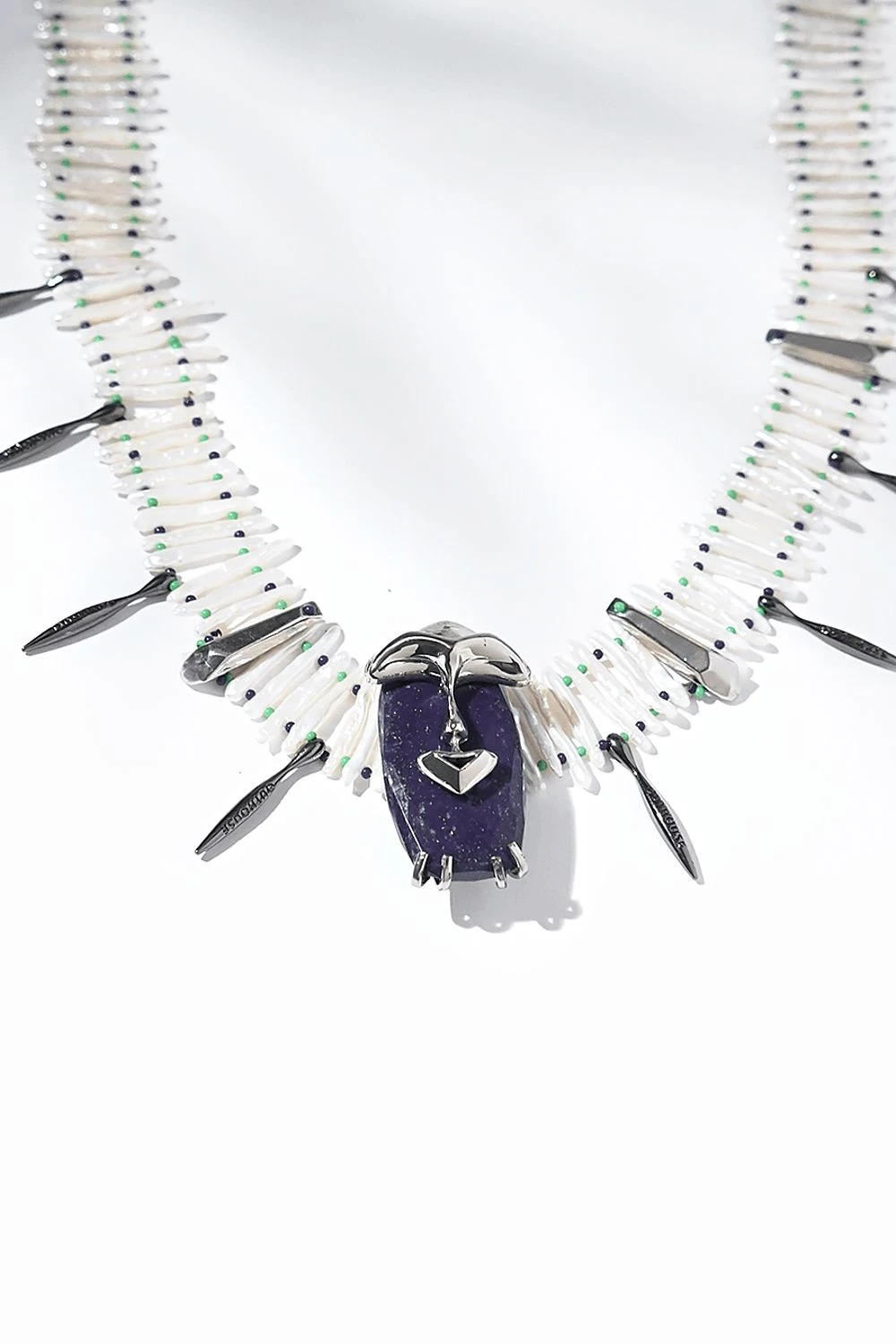 The shroomhead ivar necklace is carefully handmade in 22 KT silver finish, amalgamated with lustrous keshi pearls and blue lapis stone. Style this exquisite piece with both Indian and contemporaray looks with equal ease.