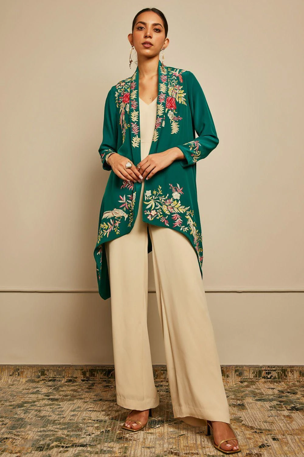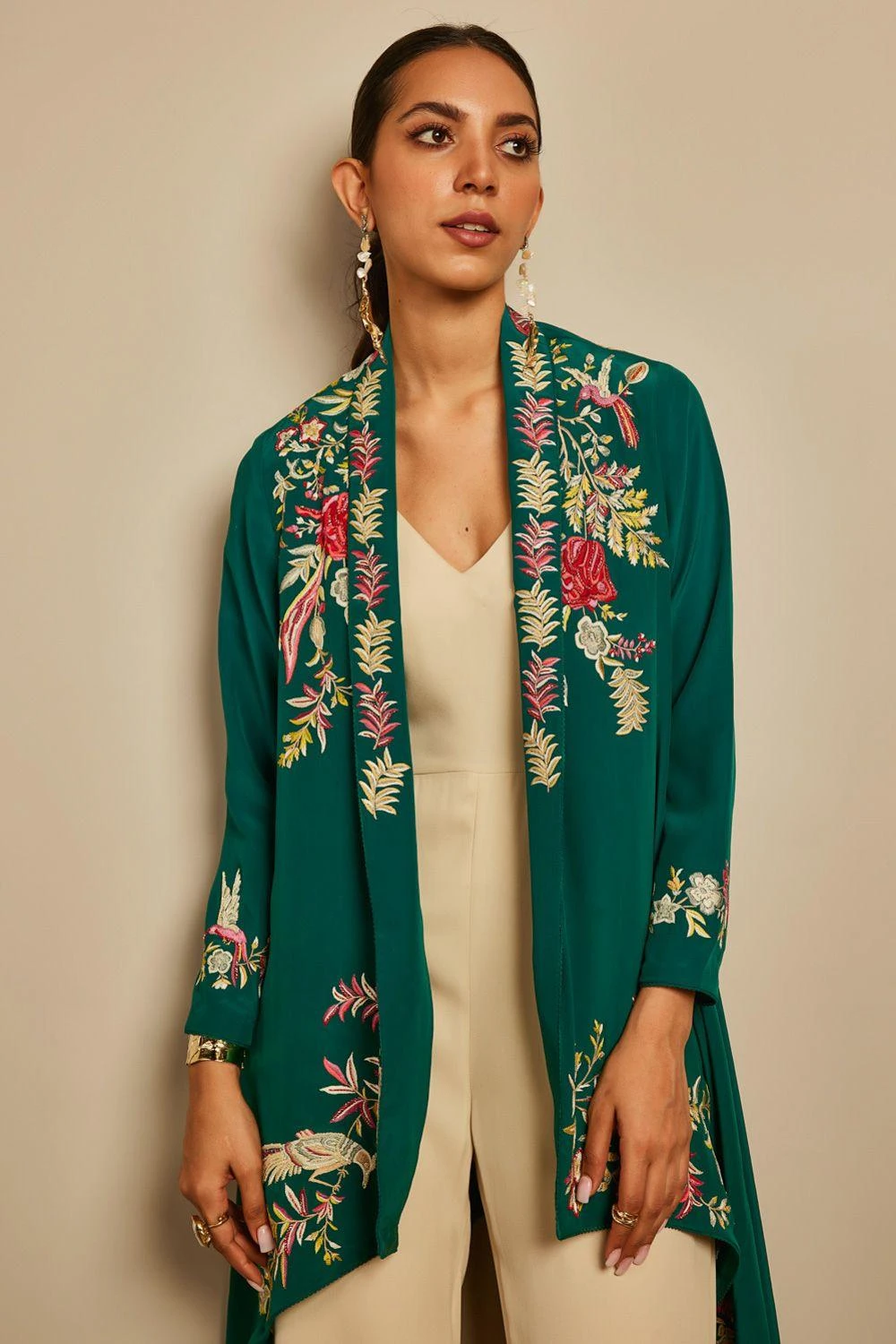 Elevate any basic look with this emerald green shrug in silk crepe. It instantly adds colour to your outfit and the gara embroidery makes it look dressy. You can style it with a neutral coloured dress or co-ord set.