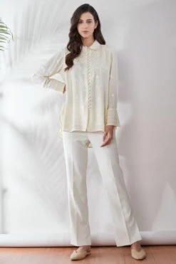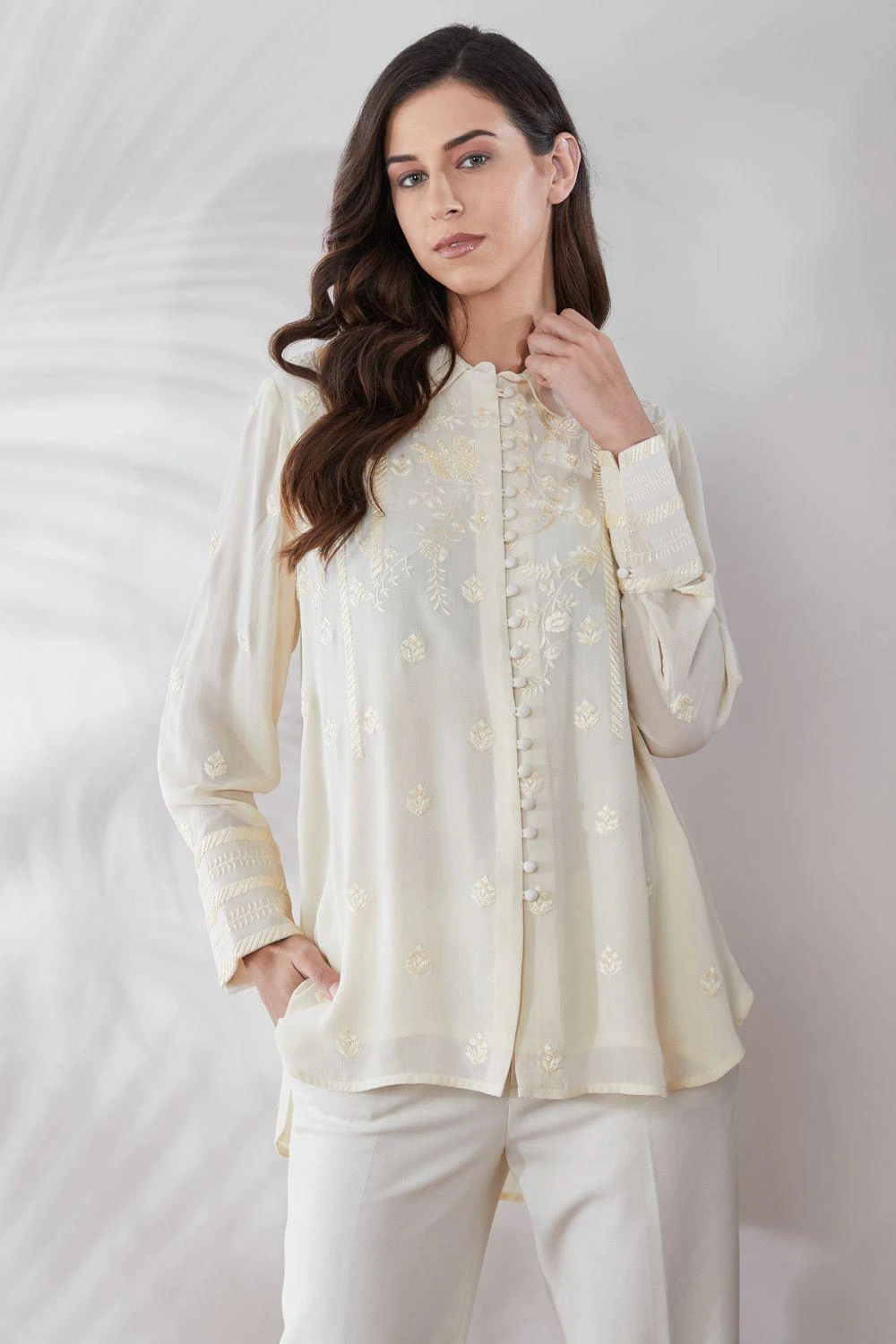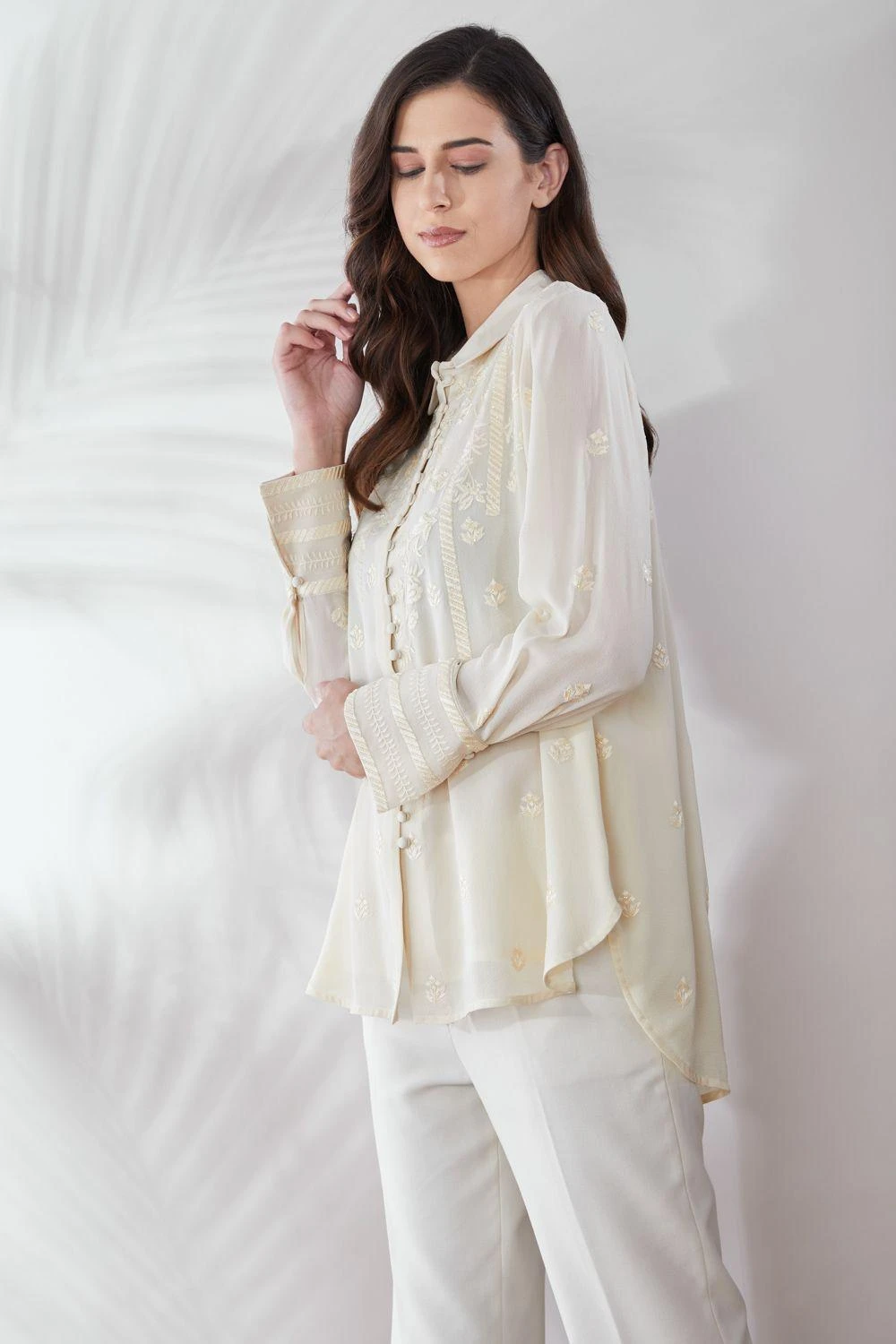 This elegant ivory shirt is cut in luxe silk georgette fabric and features a front buttoned up placket. It is adorned with white gara silk embroidery and highlighted with cutdana. You can style it for both day & evening time looks.
