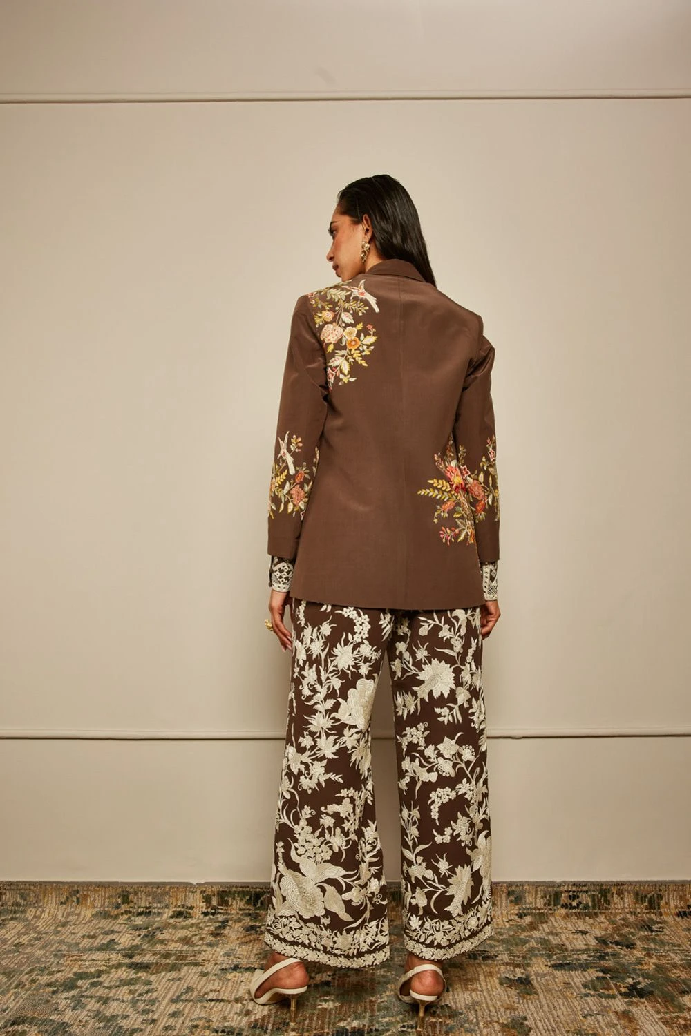 This mouse grey vivian jacket is a modern day heirloom piece. It is cut in luxe silk crepe and adorned with floral & fauna motif embroidery in silk threads. You can style it with a pair of coordinating pants from the collection.