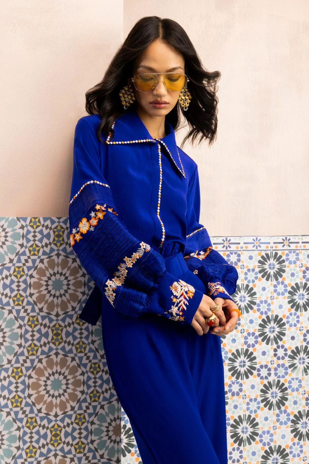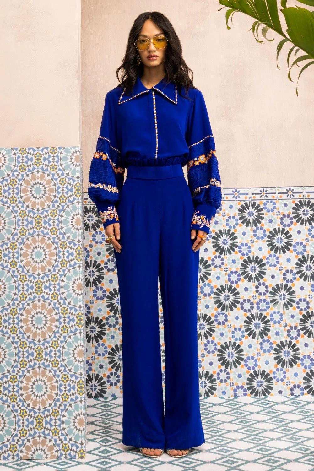 Elevate your wardrobe with this Zoe Moroccan Blue Shirt. Intricately threaded with ivory katdana using delicate techniques like French knots, this pure silk crepe piece exudes elegance and timeless beauty.