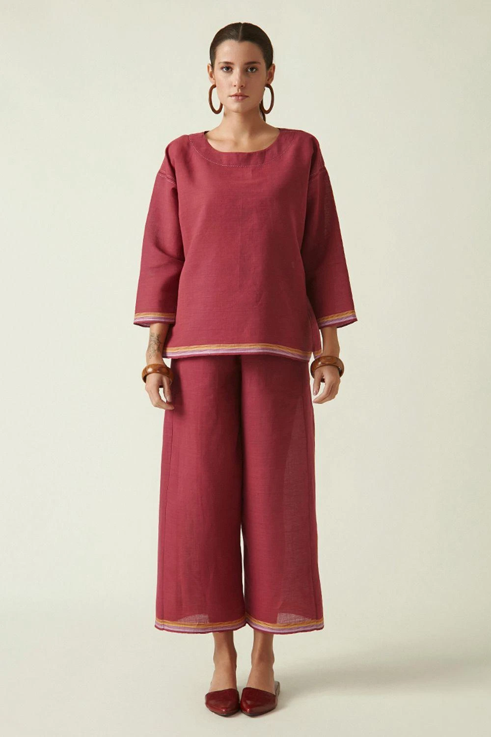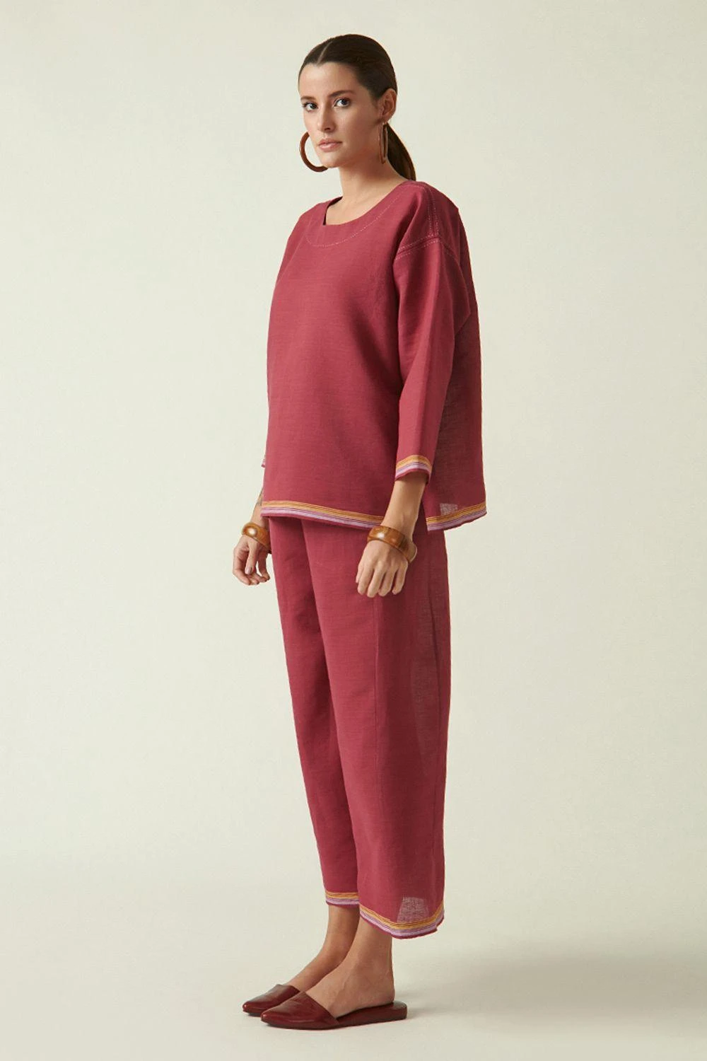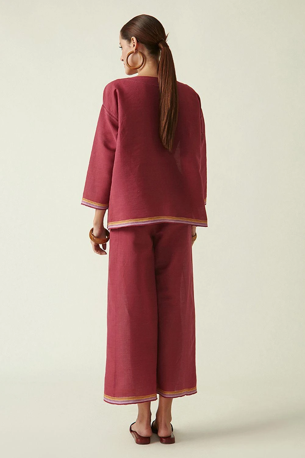 These burgundy coloured pants feature an elasticated waist with pockets and selvedge detailing at hem. Style this piece for work or a casual brunch by pairing it with the burgundy selvedge top for an effortlessly stylish look.