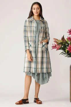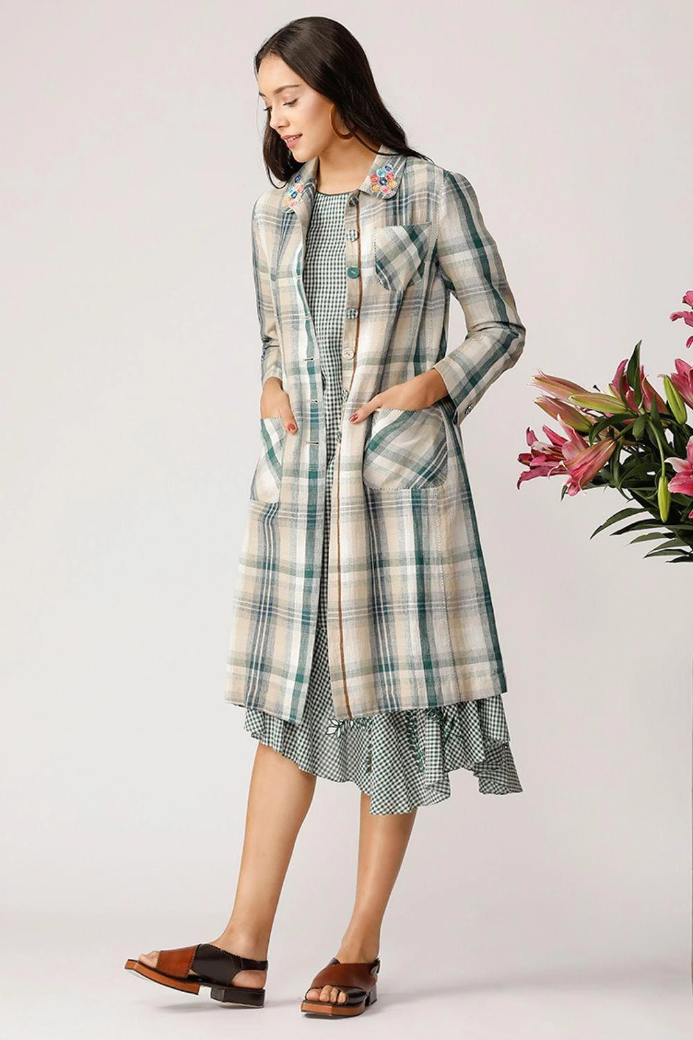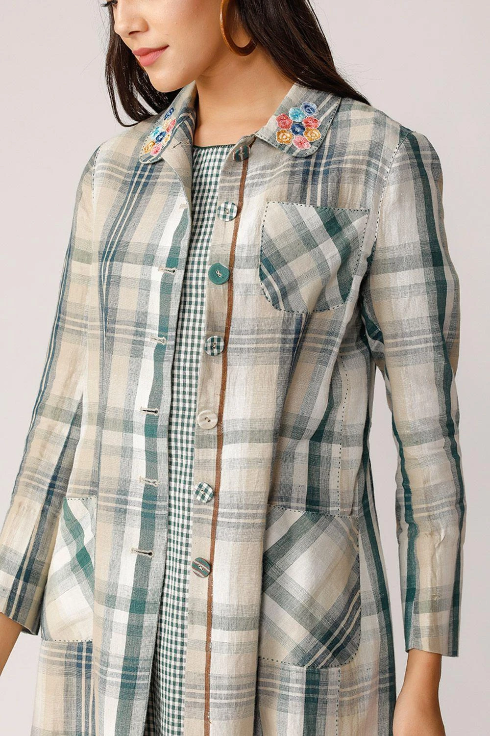 The stylish long jacket is cut in a checkered cotton linen. It is adorned with scattered floral embroidery. Style this as a light layer with your daytime looks.