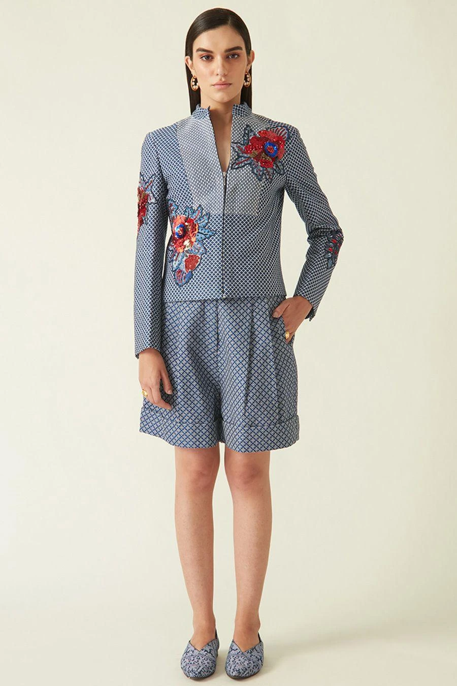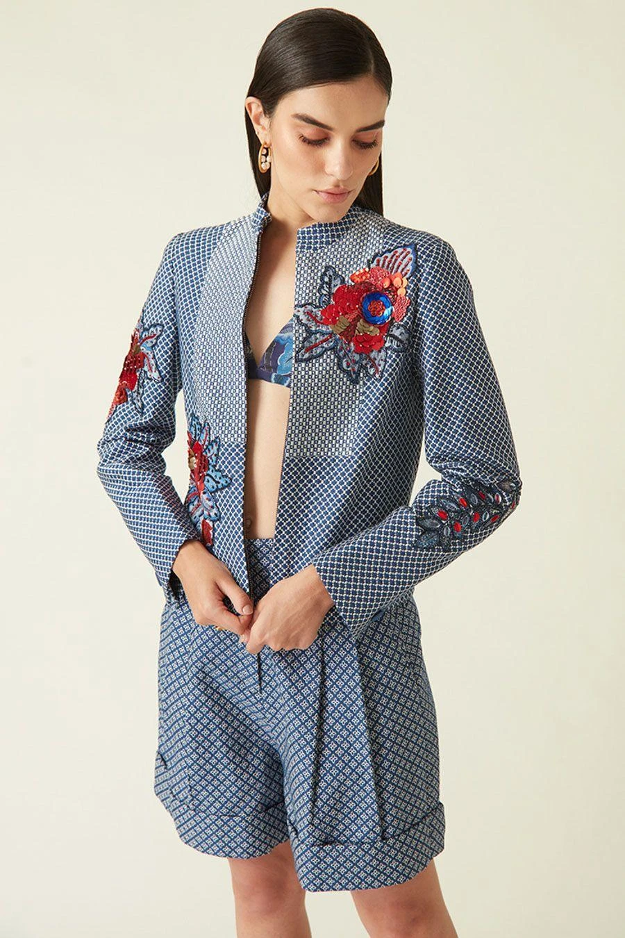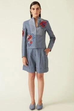 These navy blue shorts are a must have for your holiday closet. Crafted in kataan, these shorts are quilted and embroidered with side pockets. Style them with the Navy serang quilted jacket from the collection to complete the set.