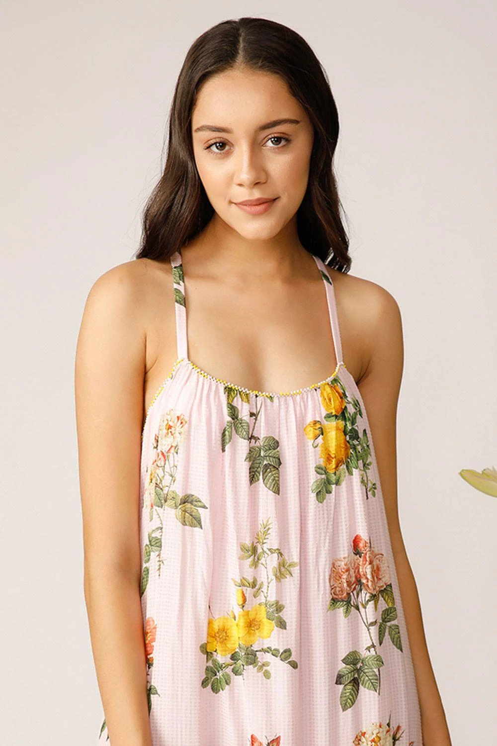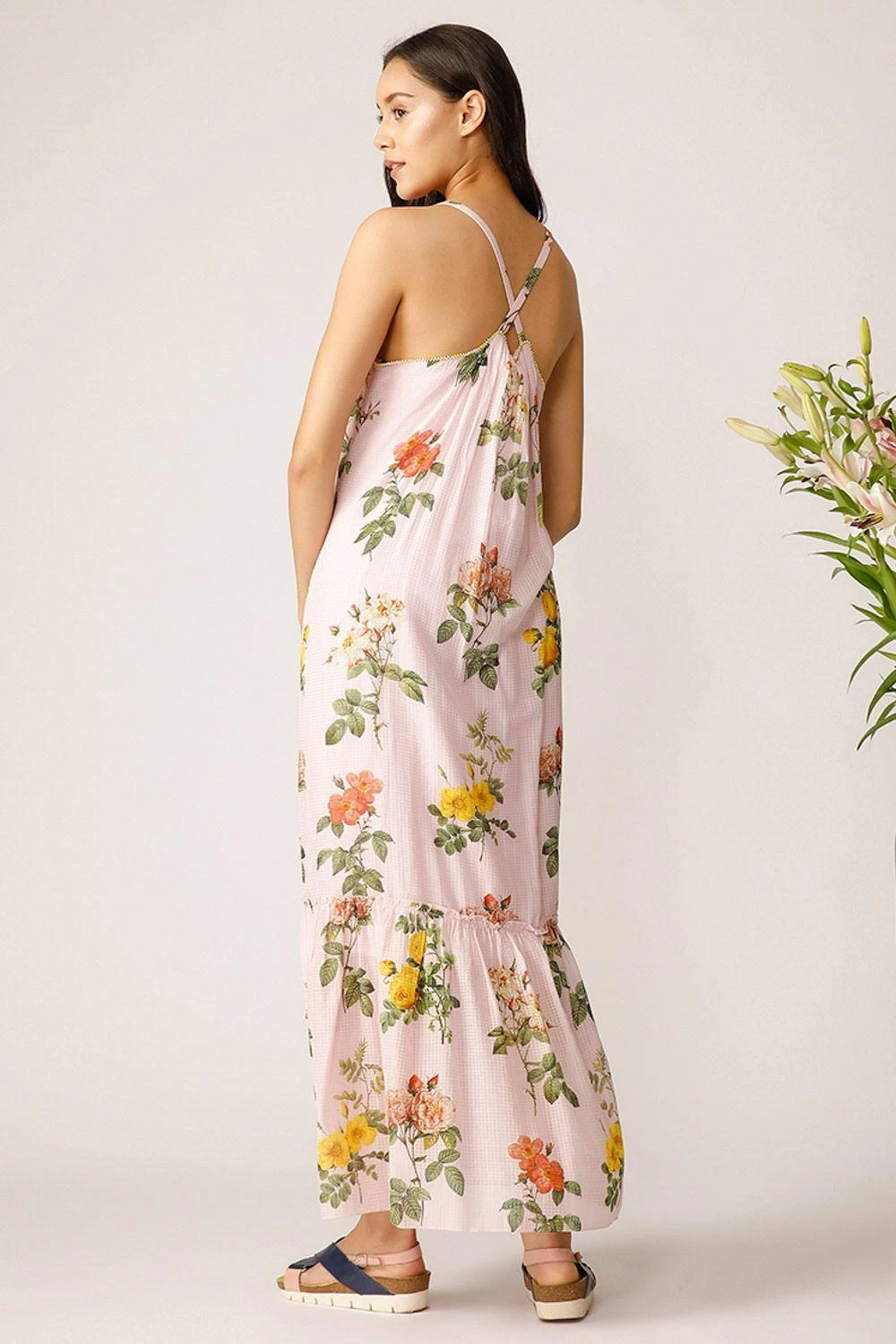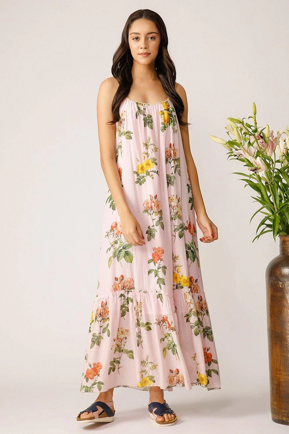 This breezy pink dress is a no-brainer pick for your next vacation. This strappy piece is woven in printed cotton viscose fabric and is lifted with gathers and hand detailing. Style it with a pair of danglers and chic flats.