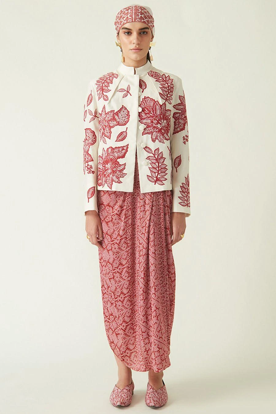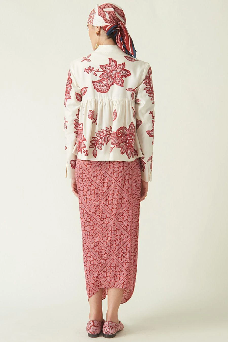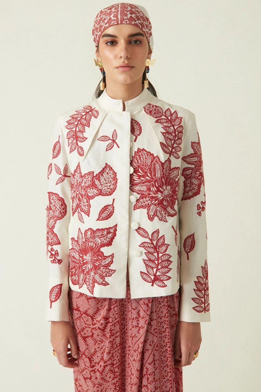 Take your layering game a notch higher with this red & ecru jacket. Crafted in cupro spun silk, this buttoned jacket features botanical embroidery placed all over. Style it with the Sipura printed skirt from the collection to complete the set.