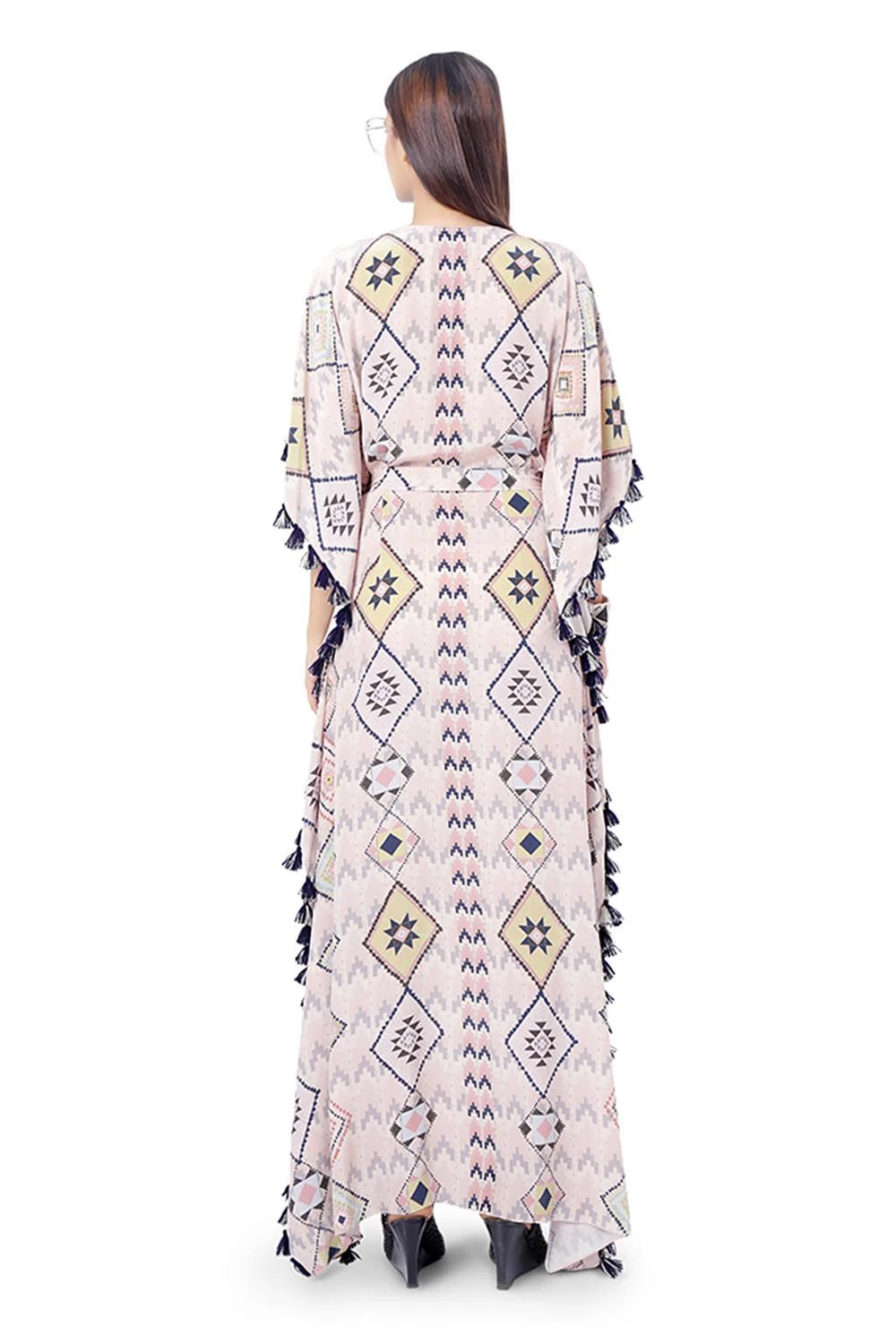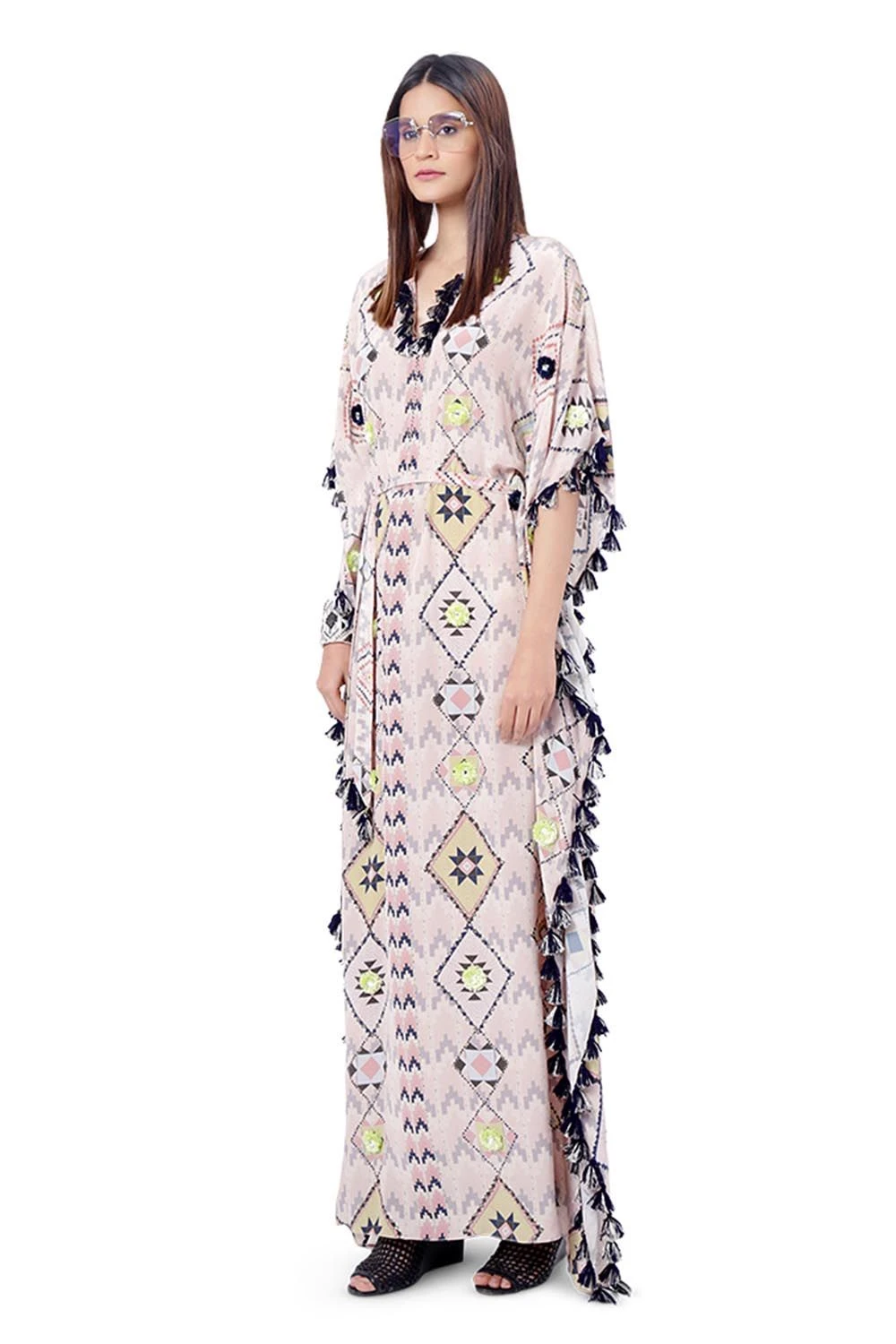 Diamond printed embroidered kaftan with belt is perfect for a lunch party .