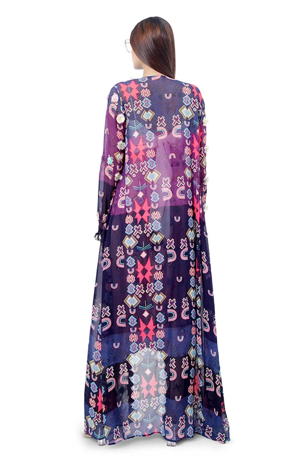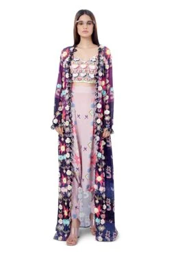 PURPLE IKAT STAR PRINT ART GEORGETTE FRONT EMB DUSTER JACKET WITH TASSELS AND CHALK WHITE GEORGETTE EMB TIE-UP CHOLI WITH PINK IKAT STAR PRINT CREPELOWCROTCH
