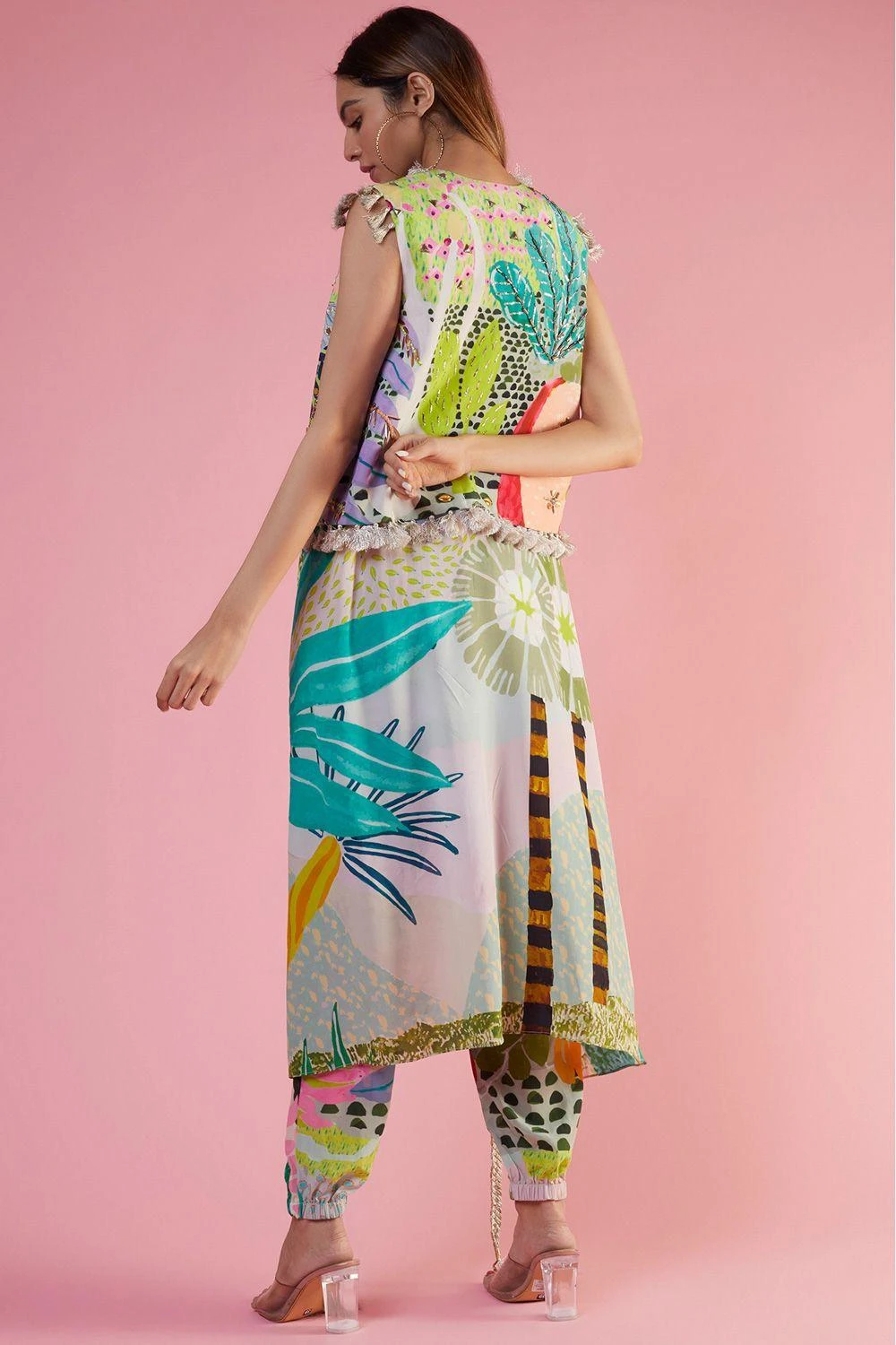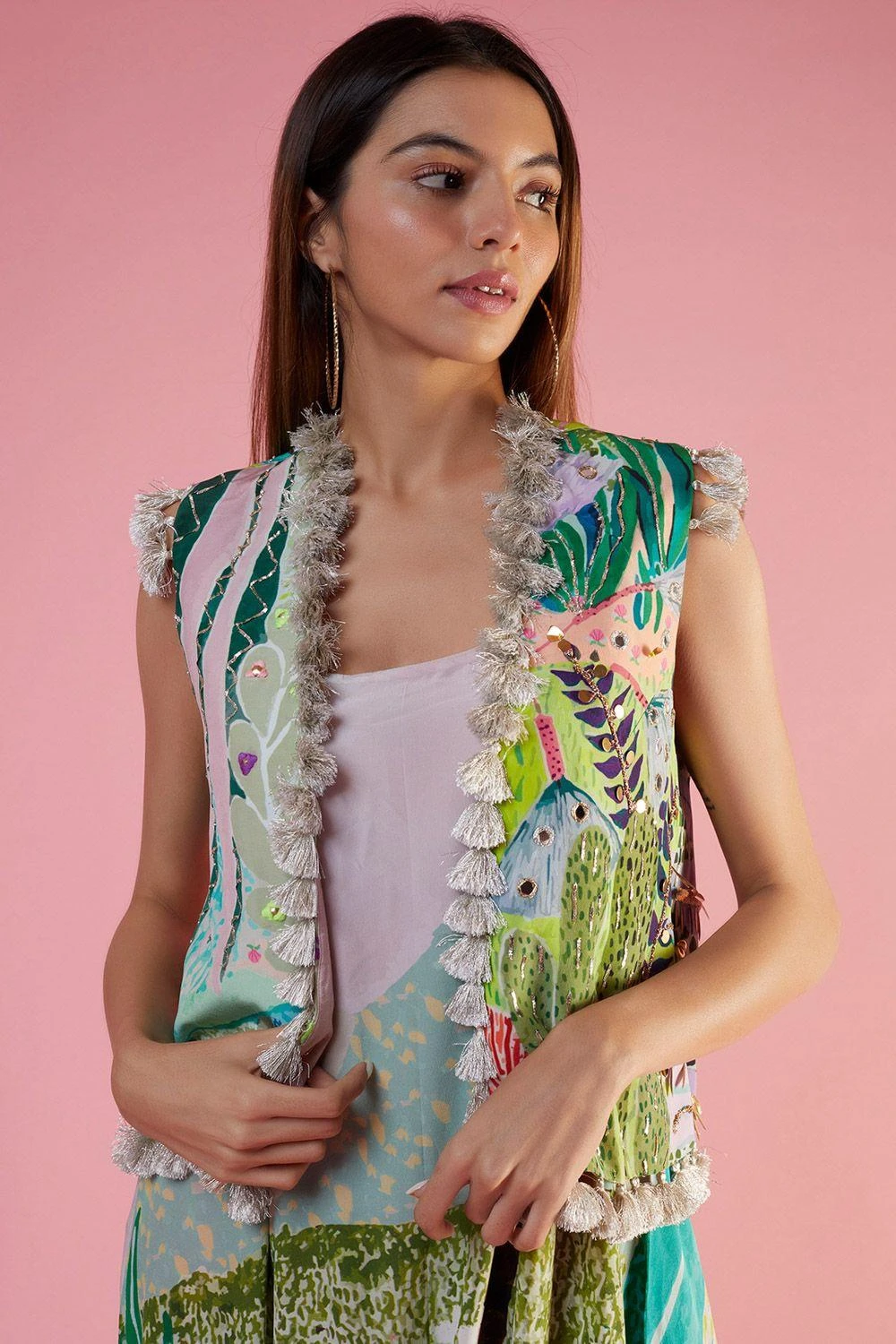 Step into opulent elegance with this embroidered jacket set. This ensemble is a testament to the perfect fusion of intricate craftsmanship and modern sophistication, setting the stage for a remarkable look.